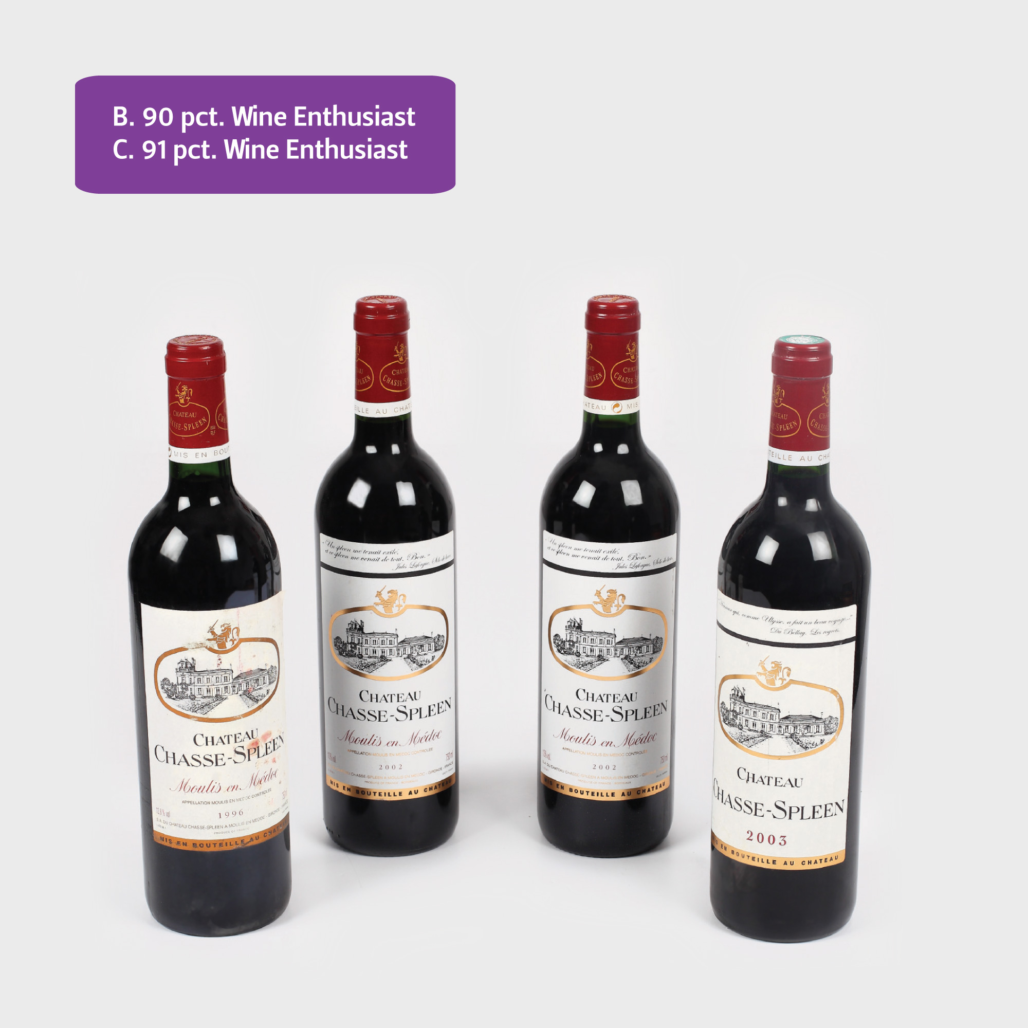 Château Chasse Spleen este considerat cel mai bun producător din apelațiunea Moulis-en-Medoc, fiind printre cei mai consecvenți și mai apreciați producători printre iubitorii de vin din Bordeaux. În cei mai buni ani de recoltă, vinul este la același nivel de calitate cu celebrele Super Seconds din clasamentul realizat în anul 1855 pentru vinurile din Bordeaux. Vinul este un cupaj majoritar de Cabernet Sauvignon cu Merlot și puțin Petit Verdot, care-i oferă o notă exotică. Provine din vii vechi de minim 30 de ani, fiind maturat timp de 14-18 luni în baricuri de stejar franțuzesc (40% nou), îmbuteliat nefiltrat. Fiecare dintre cele 3 vinuri reflectă foarte bine caracteristicile anului de recoltă, însă toate poseda tipicitatea și stilul caracteristic proprietății. 1996 este un vin matur, superb astăzi, 2002 are o expresivitate extraordinară iar 2003 reflectă căldura anului prin opulența aromelor și taninul dulce.
