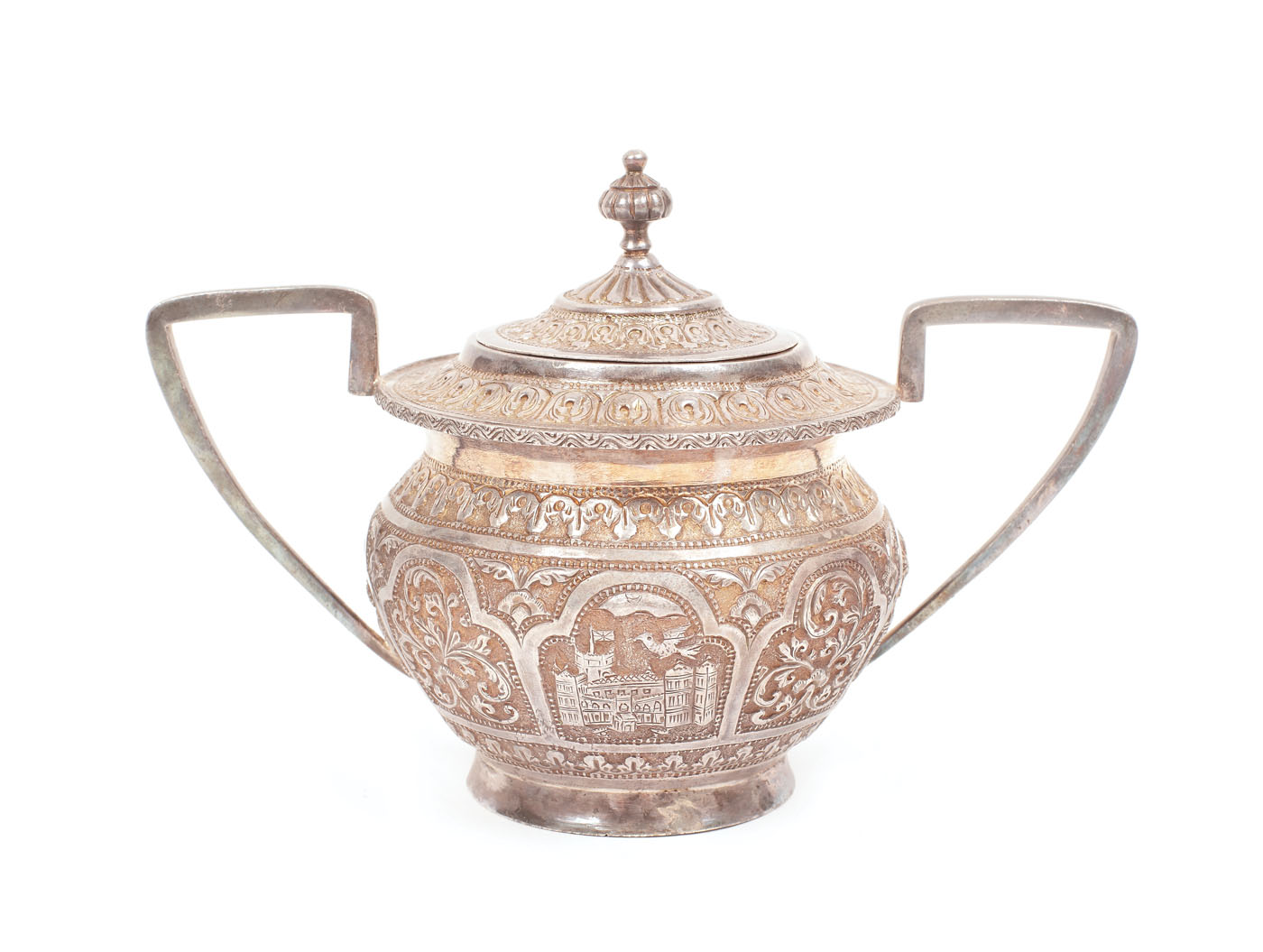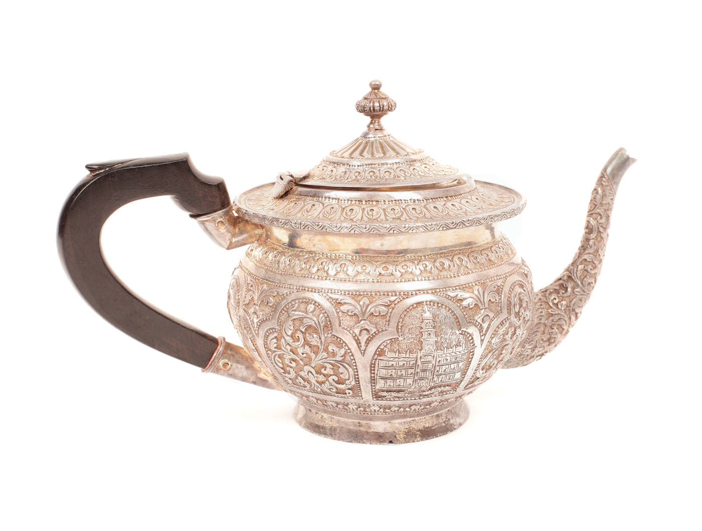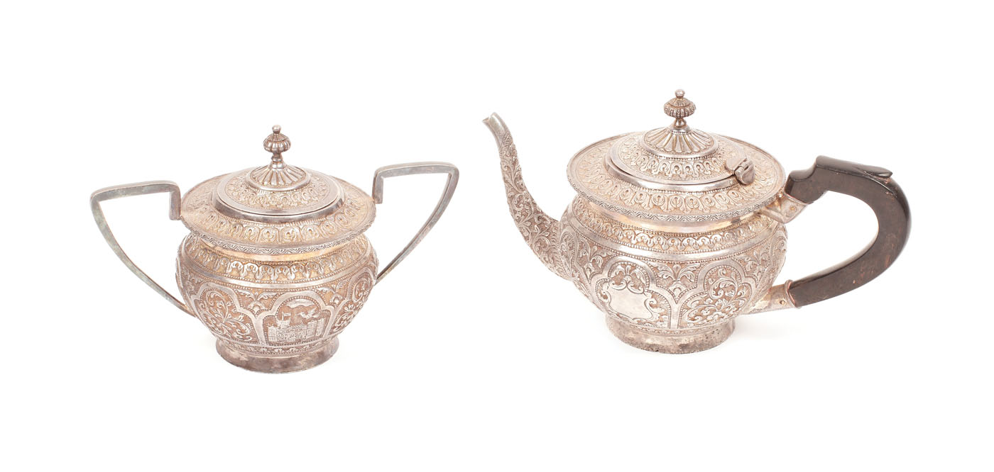135. Ceainic și zaharniță din argint, bogat decorate cu motive floral-vegetale și arabescuri, India, sec. XX