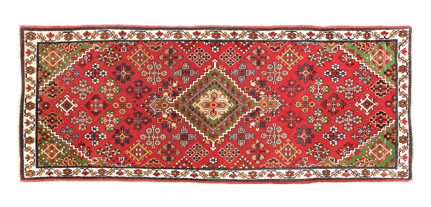 108. Covor Shiraz-Abadeh din lână, decorat cu motive tradiționale geometrice, Persia, cca. 1950