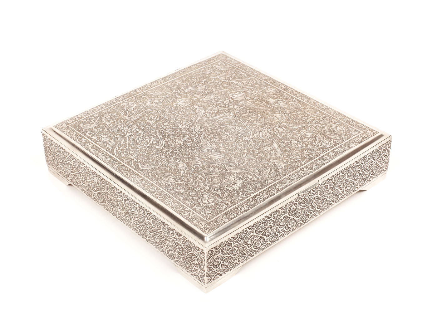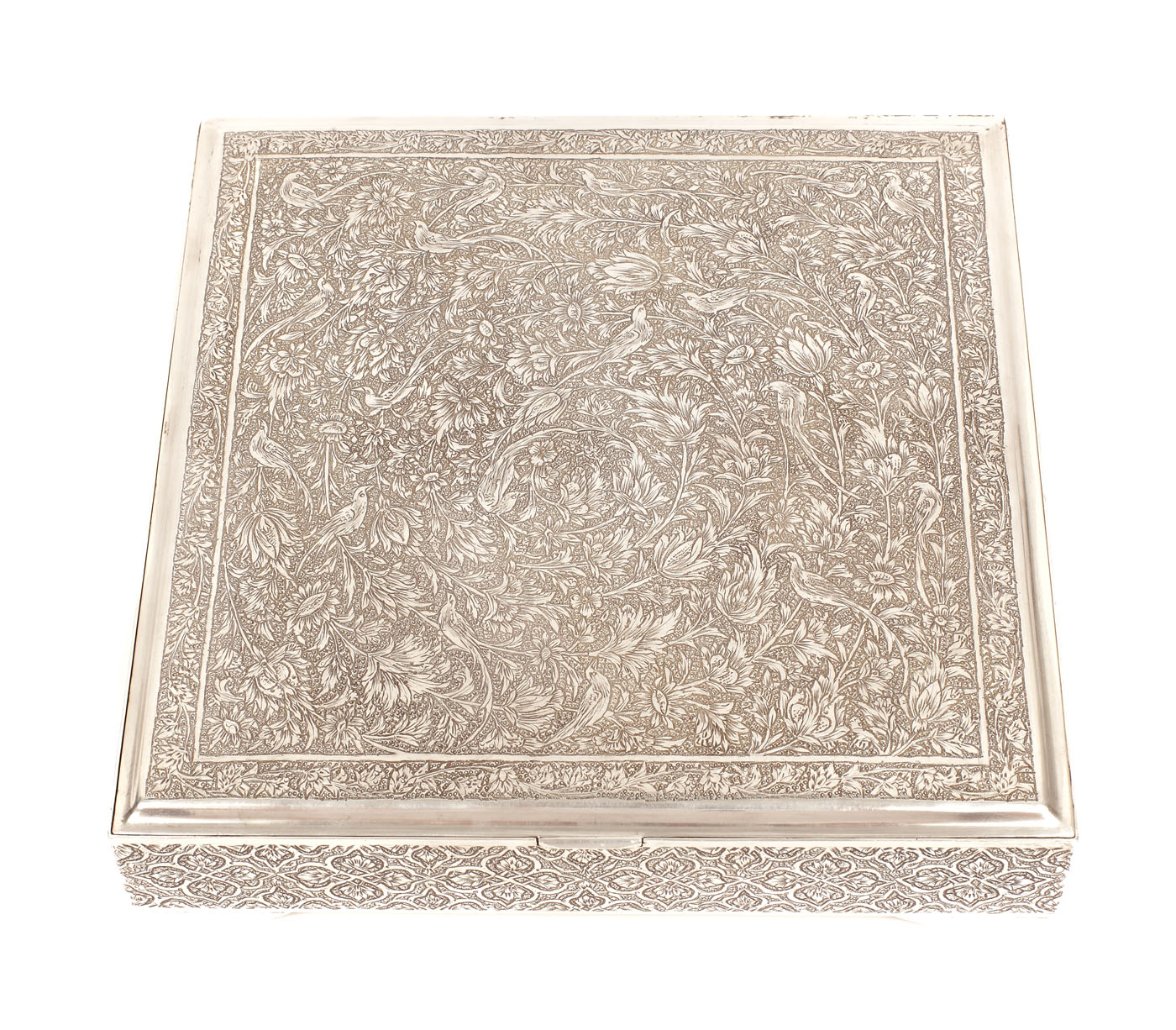 141. Cutie din argint Isfahan, pentru țigări, cu elaborat decor floral și păsări, prima jumătate a sec. XX