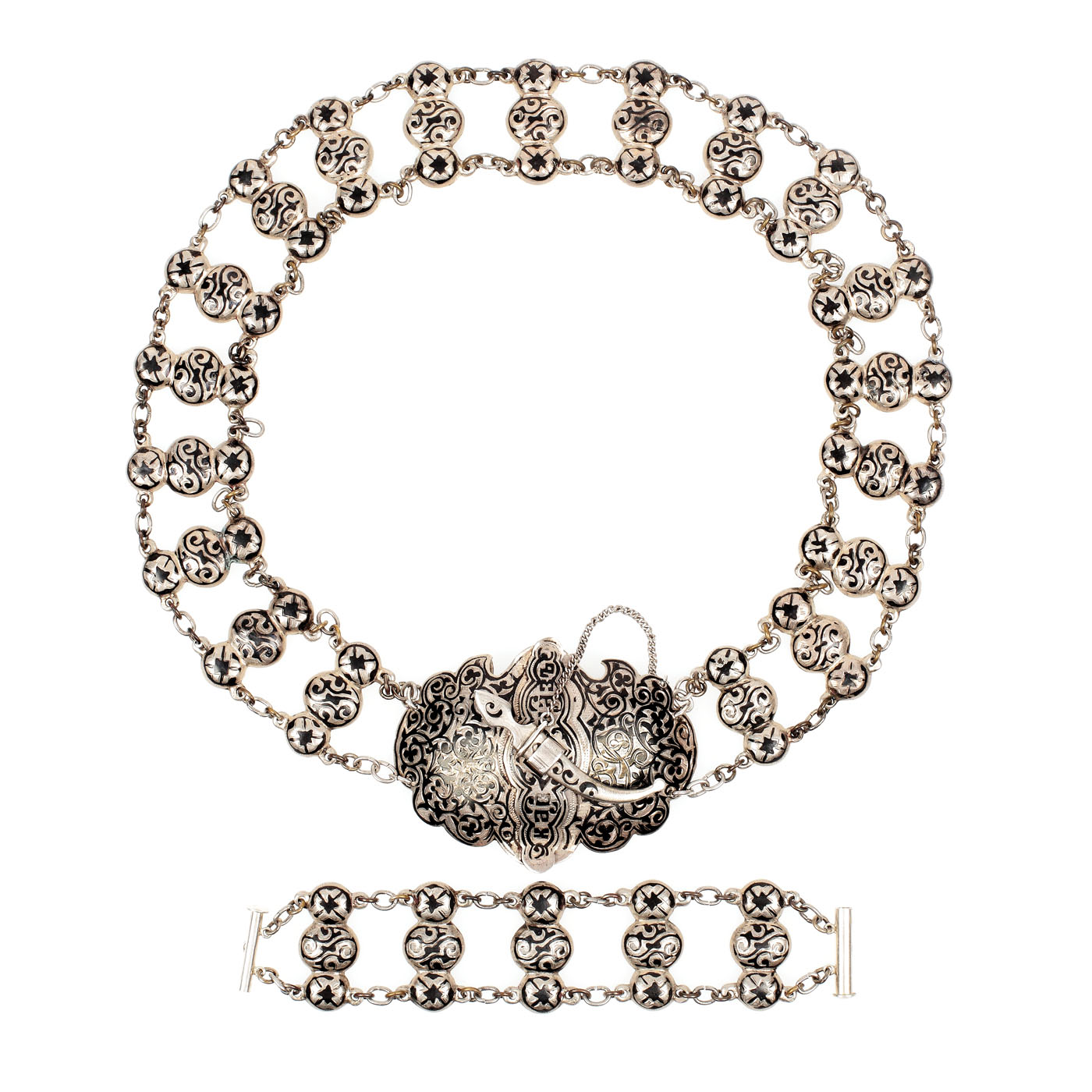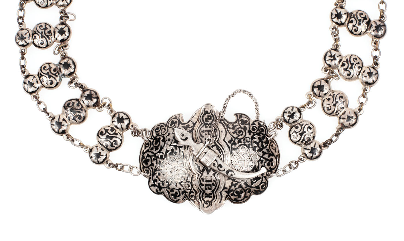 137. Garnitură din argint niello, orientalistă, alcătuită din brâu cu pafta și brățară, cca. 1905