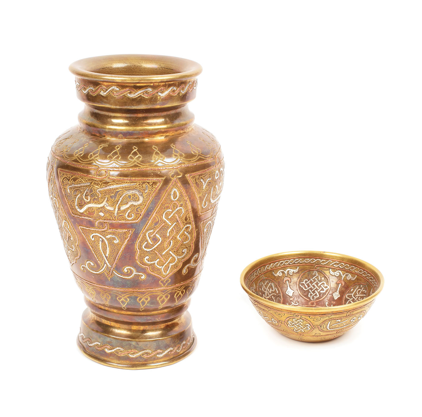 147. Pereche de vase din alamă damaschinată cu argint, decorată cu arabescuri