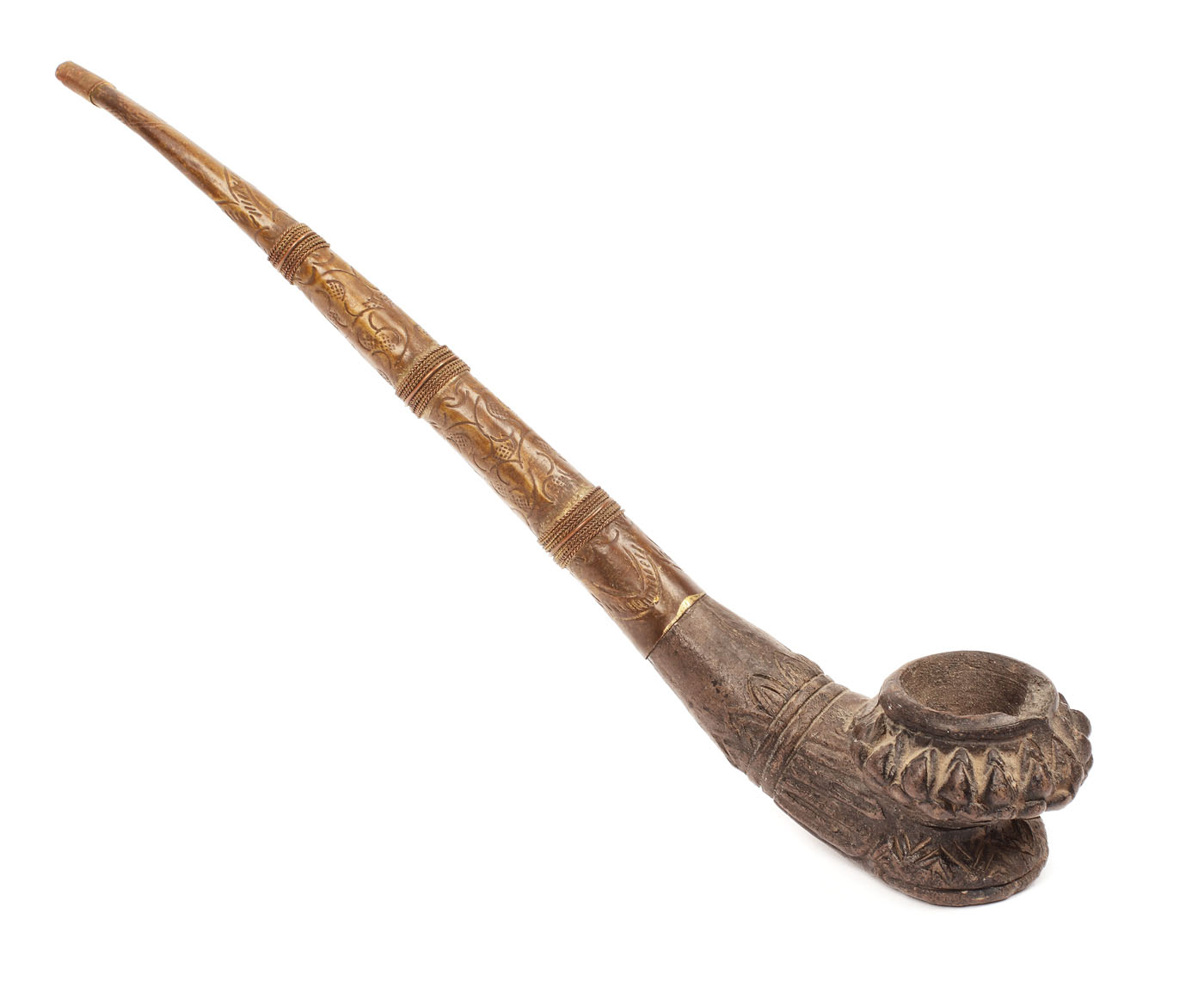 125. Pipă din alamă și lemn, decorată cu motive vegetale, sec. XX