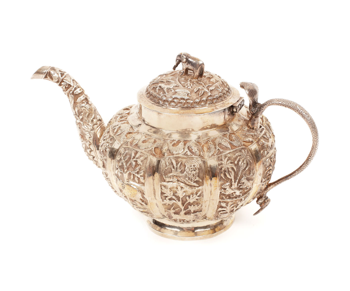 134. Set din argint, pentru ceai, format din ceainic, letieră și zaharniță, cu decor floral în relief, India, sec. XX