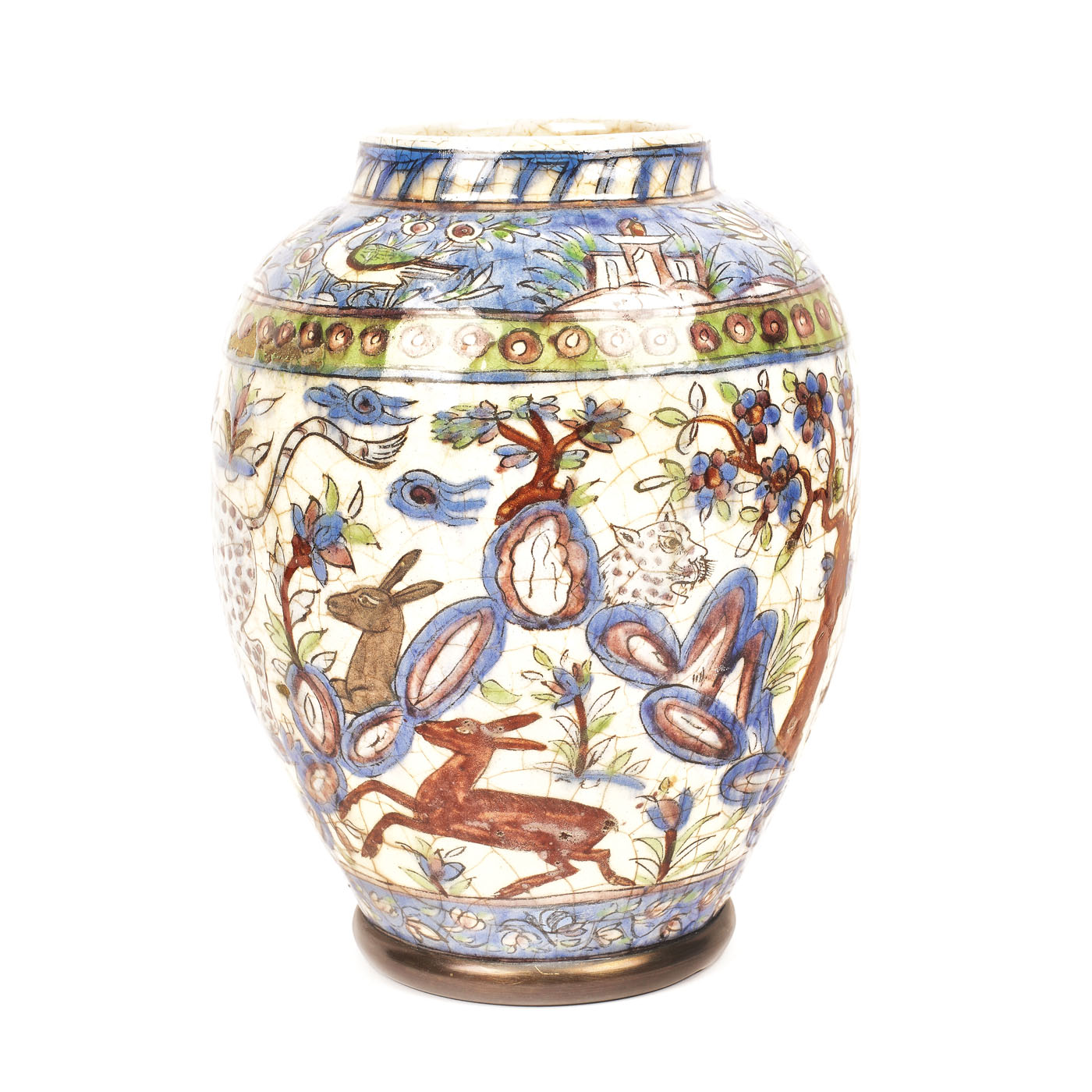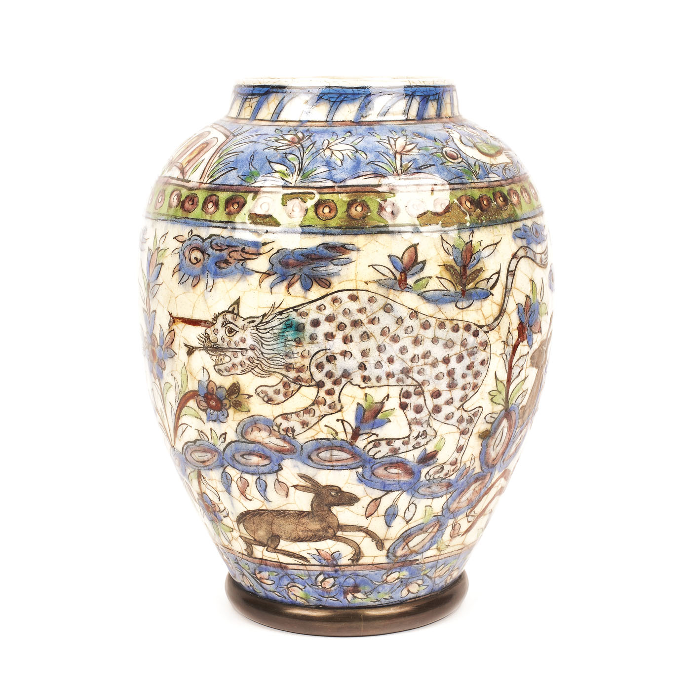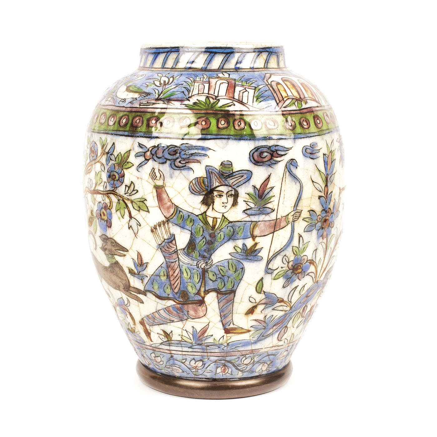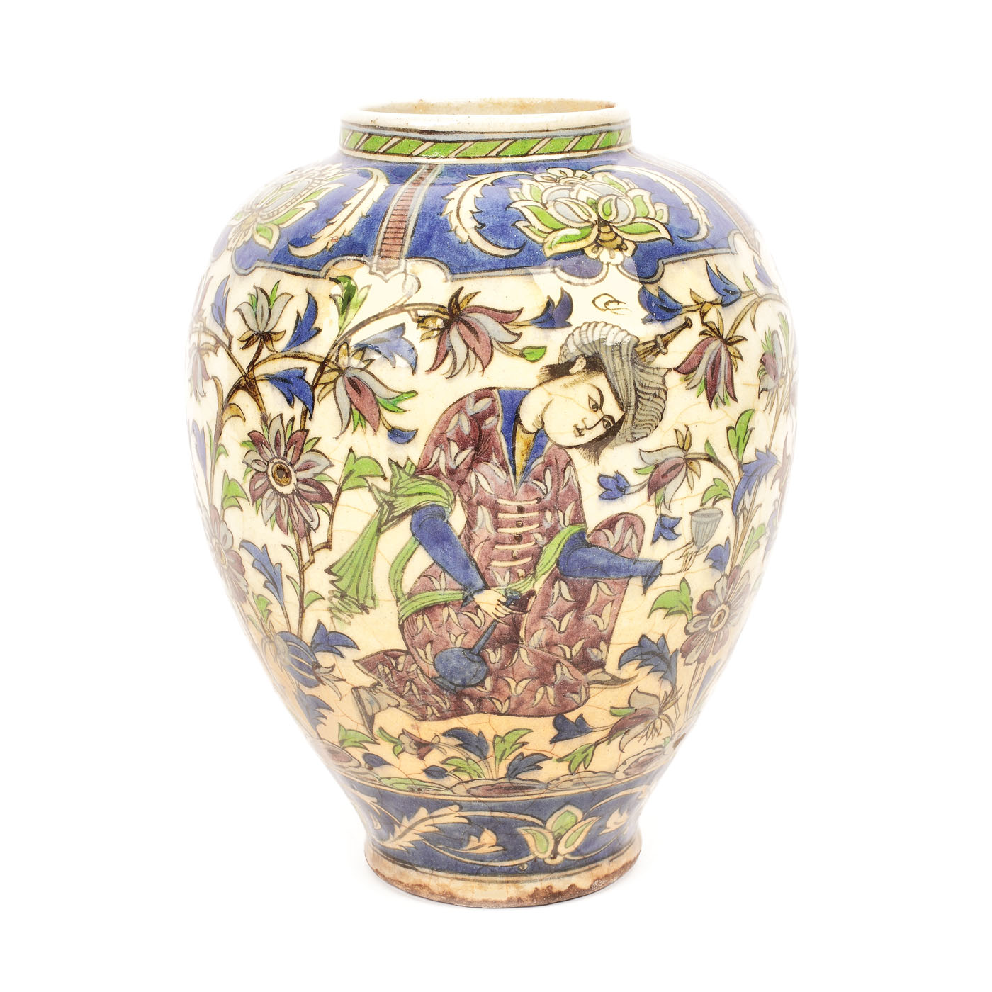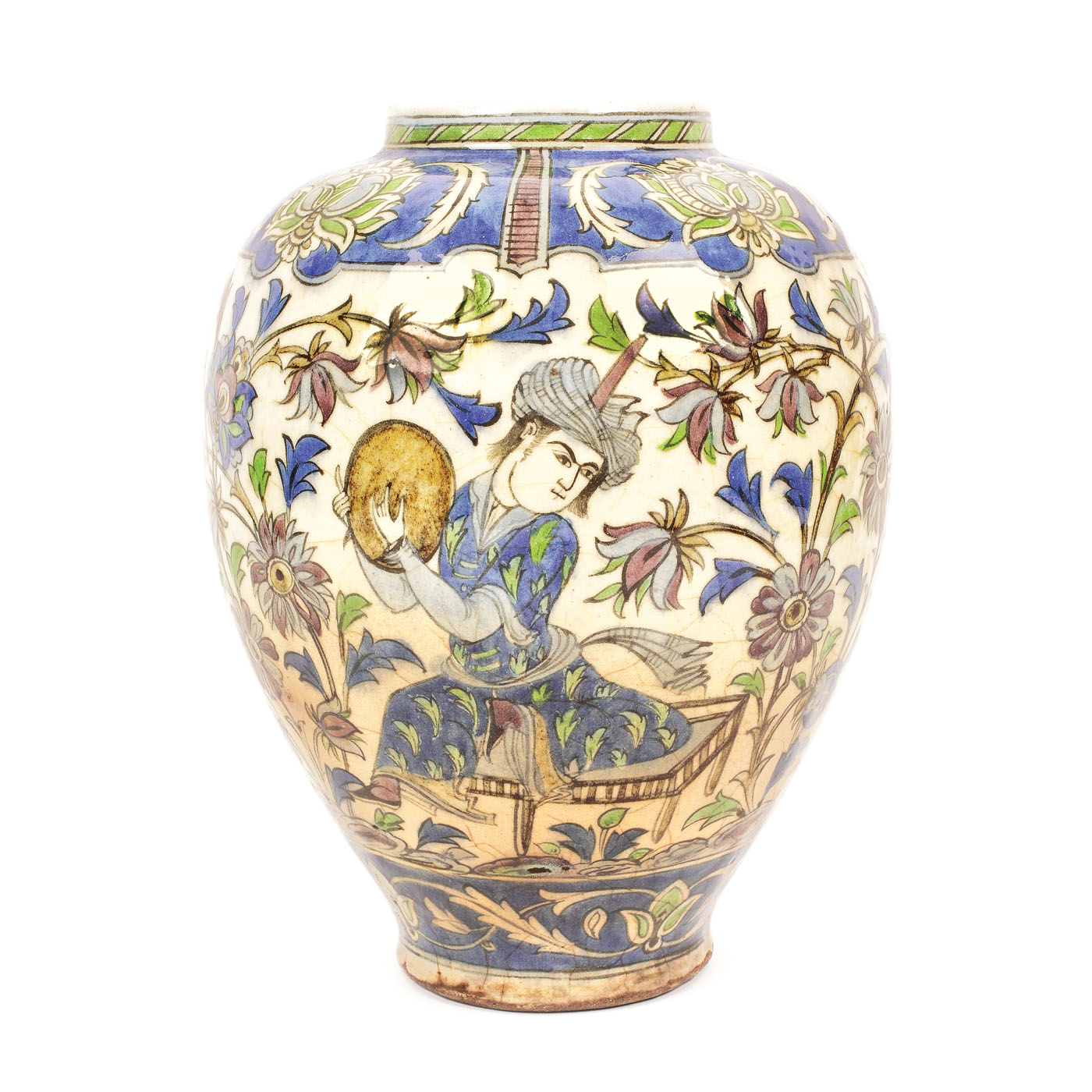 112. Vas din ceramică ilustrând trei menestreli, decorat cu motive floral-vegetale, din timpul dinastiei Qajar, Persia, sec. XIX