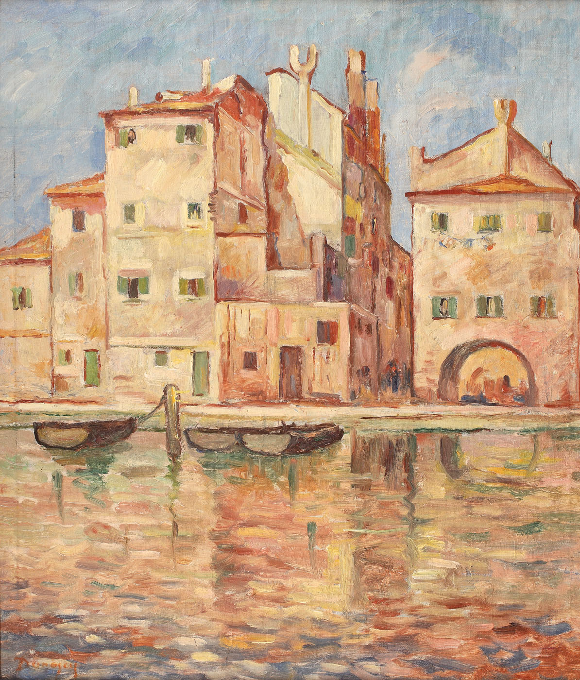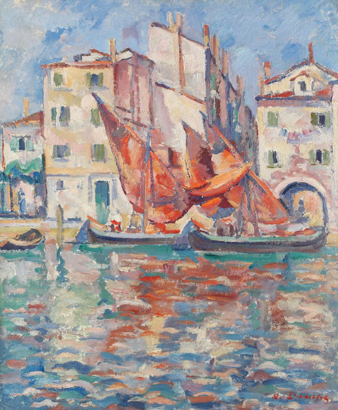 Prima călătorie pe care Dărăscu o întreprinde în nordul Italiei, la Veneția și Chioggia, se consuma în jurul lui 1910, aceeași perioadă în care Gheorghe Petrașcu descoperea și el vedutele lagunare. Pentru o perioadă de mai bine de 25 de ani, artistul iniția astfel, asemeni colegului de generație, ciclul dedicat canalelelor, lagunelor, piețelor și ponturilor Veneției și Chioggiei, etapă în care pictura i s-a modelat și definitivat sub imperiul culorii. În interbelic, Dărăscu dedică o bună parte a verilor vizitelor în Italia, una dintre cele mai importante călătorii consumându-se în cursul anului 1926, itinerar materializat un an mai târziu în expoziția intitulată “Veneția”, moment ce îl propulsa în elita peisagiștilor. Opera de față se integrează lesne în seria “venețiilor” realizate de Dărăscu, marcând totodată și concretizarea unui stil inconfundabil, influențat profund de atmosfera, cromatica și peisajul marin oferit de orașul italian. (I.P.)