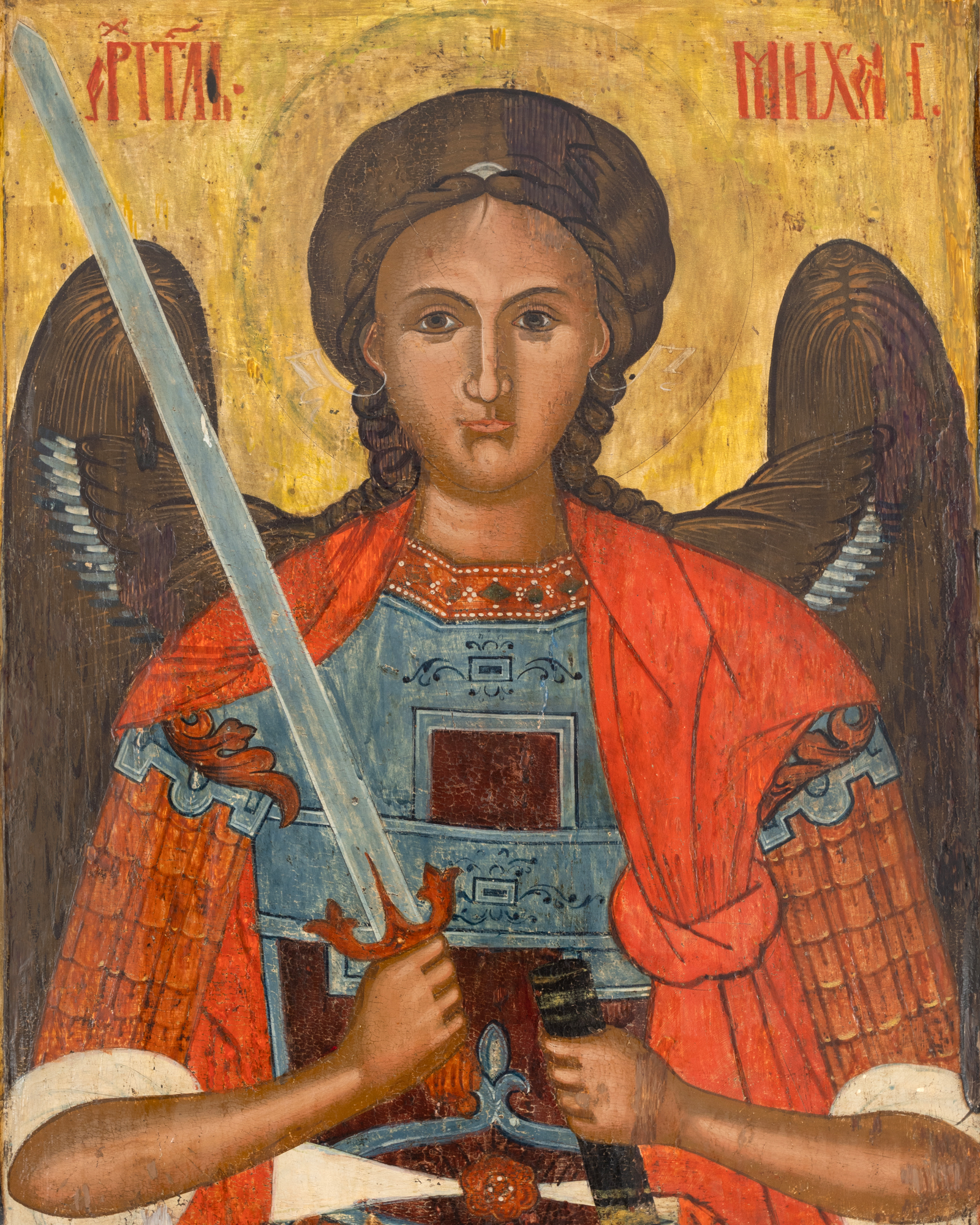 1Т. Icoană împărătească pe lemn, ”Sfântul Arhanghel Mihail”, Țara Românească, școală pre-brâncovenească, epoca lui Matei Basarab, mijlocul sec. XVII, piesă muzeală