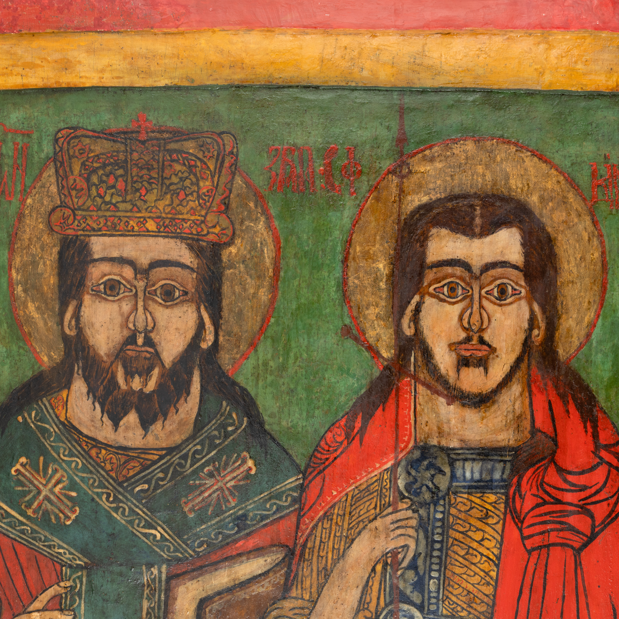 29. Icoană împărătească pe lemn, ”Sfântul Ioan Gură de Aur și un sfânt militar”, școală post-brâncovenească, probabil Banat, sfârșitul sec XVIII - începutul sec. XIX