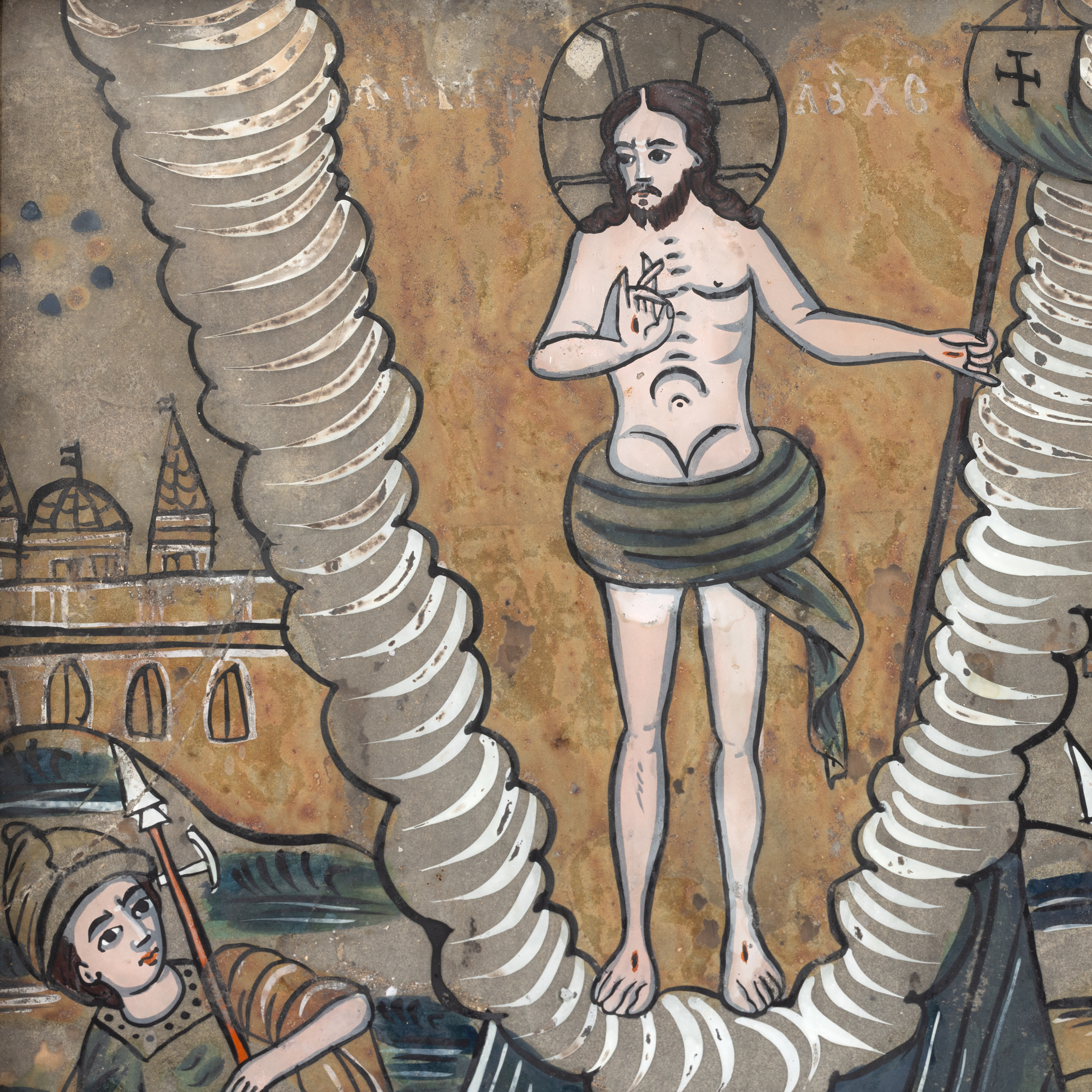 83. Icoană pe glajă, ”Învierea Domnului”, ramă pictată, atribuită zugravului Nicolae Oancea din Vale, Mărginimea Sibiului, jumătatea sec. XIX, piesă rară, de colecție