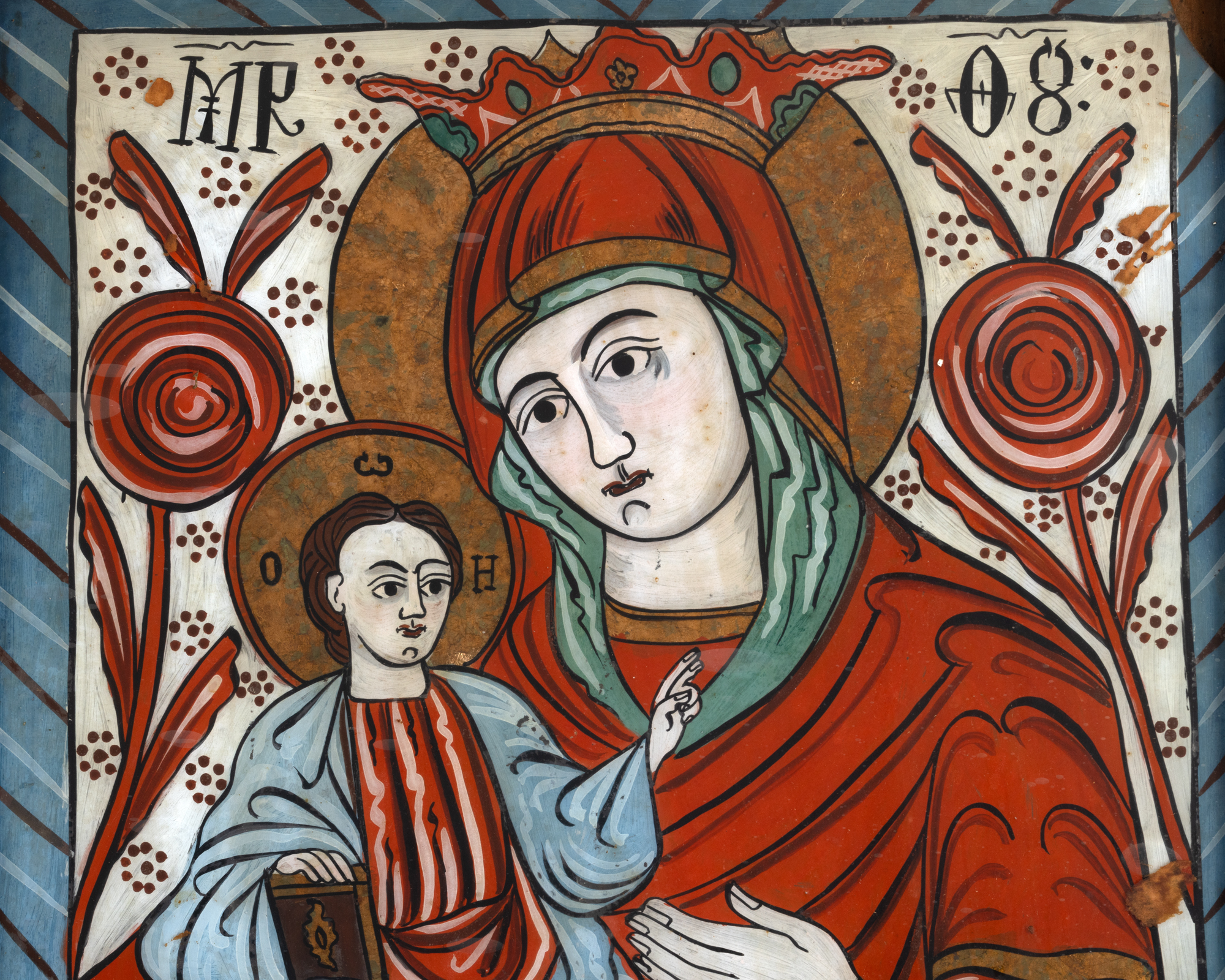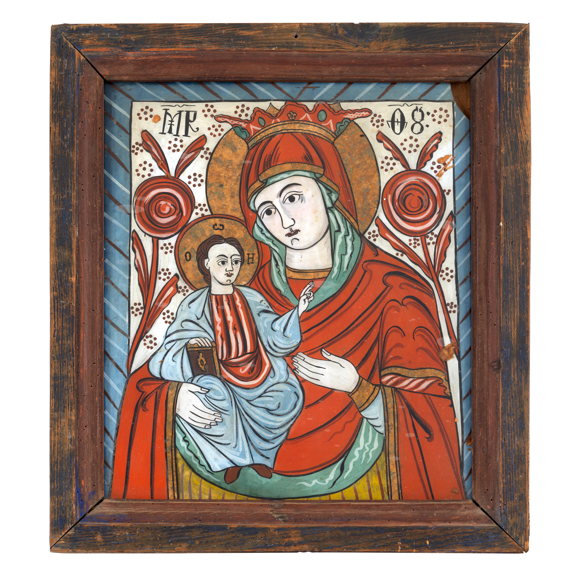 81. Icoană pe glajă, ”Maica Domnului cu Pruncul”, atelierul familiei Tămaș, probabil Moise Tămaș, jumătatea sec. XIX