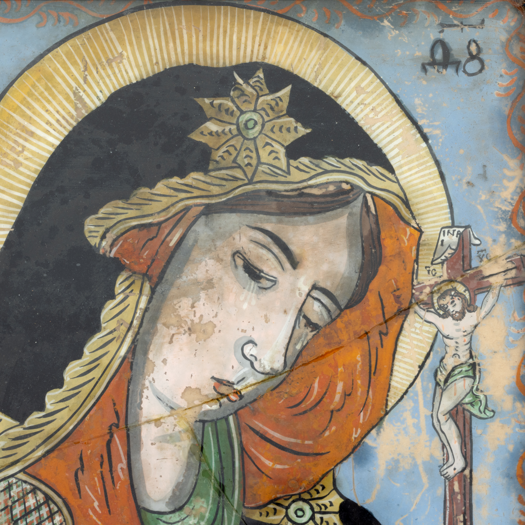 85. Icoană pe glajă, "Maica Domnului Îndurerată", atelierul familiei Oancea din Vale, probabil Nicolae Oancea, Mărginimea Sibiului, prima jumătate a sec. XIX