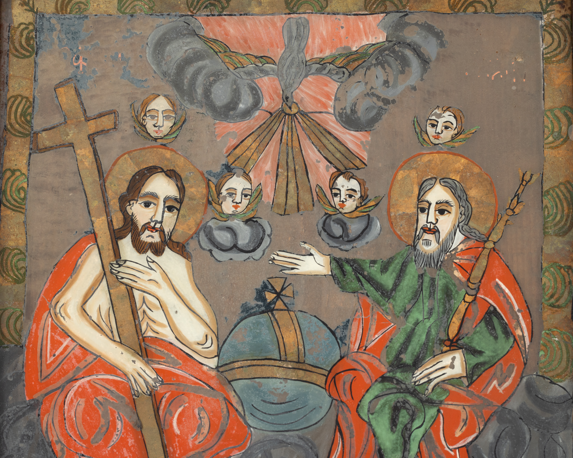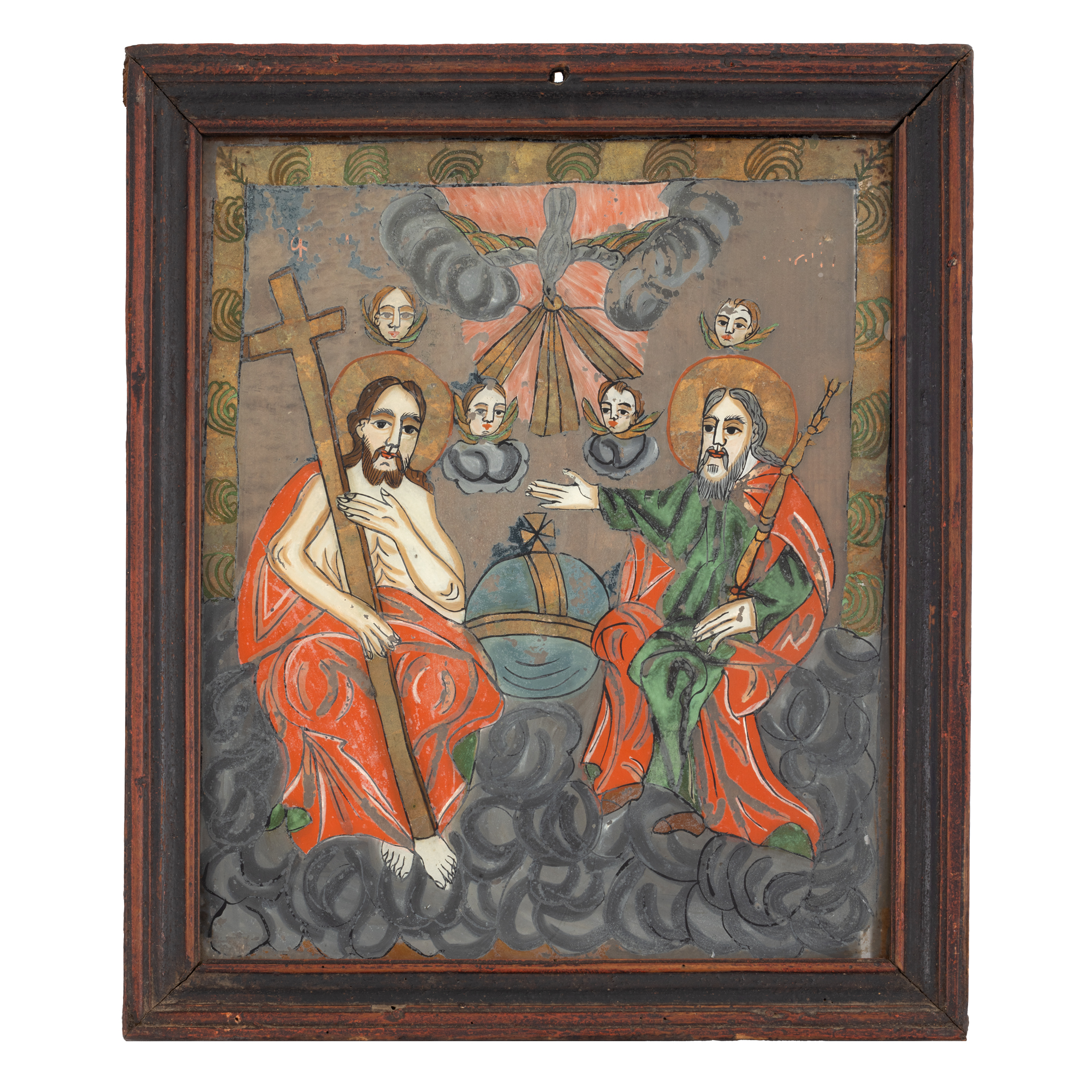 Redată în versiunea occidentală nou-testamentară, compoziția îi cuprinde pe Dumnezeu Tatăl, de-a dreapta Sa, este Fiul, iar de sus, pogoară o mandorlă cu Duhul Sfânt. Fiul are în mâna dreaptă Crucea, iar Tatăl, sceptrul. Torsul Mântuitorului este dezgolit, purtând doar un himation roșu, dublat cu verde. Tatăl și Fiul stau pe un tron de nori, iar între Ei este globul puterii. Autorul se numără printre primii ucenici ai celor doi iconari care au întemeiat, în 1796, primul atelier de pictură pe sticlă din Nicula (M.B.).