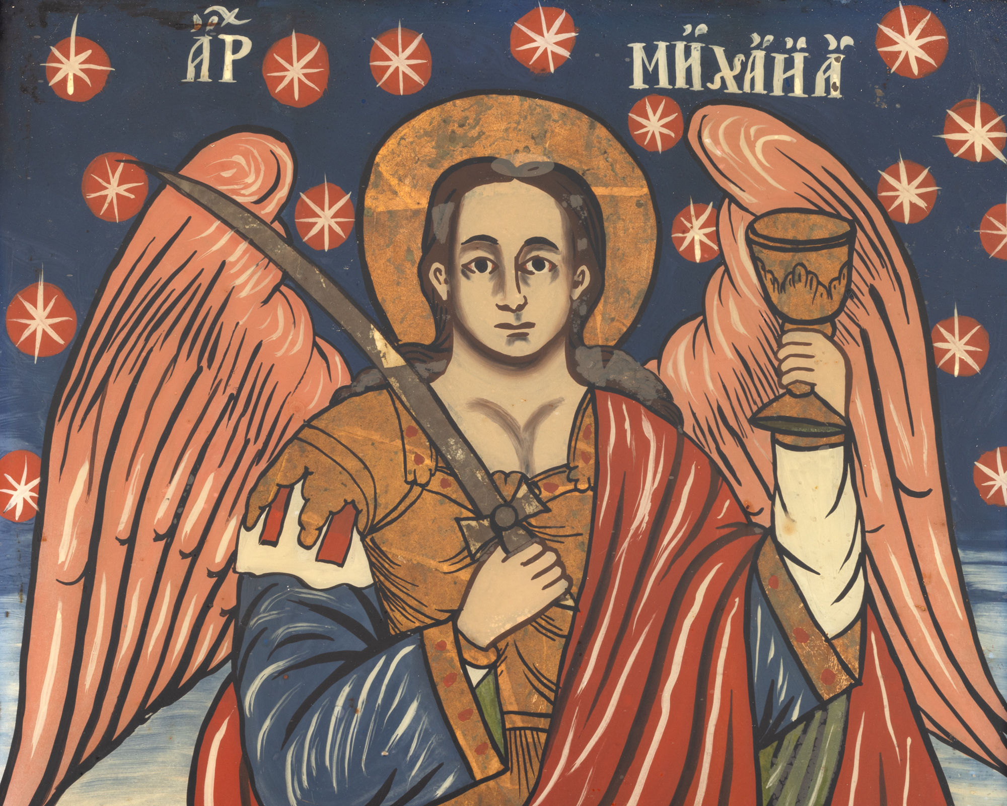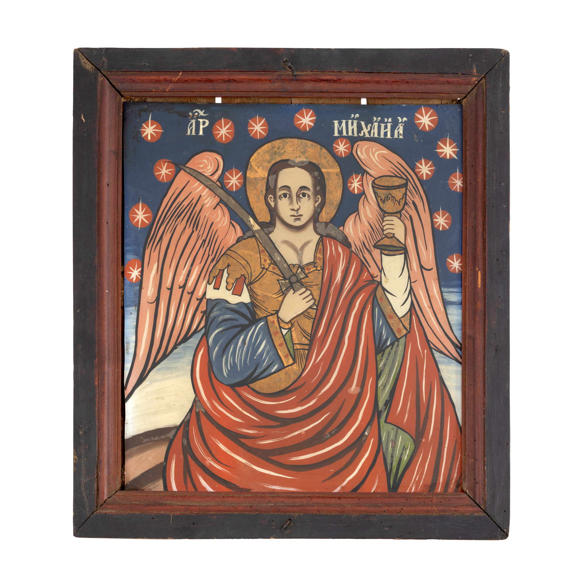 76. Icoană pe glajă, "Sfântul Arhanghel Mihail", atribuit zugrav Nicolae Cațavei, Făgăraș, jumătatea sec. XIX, piesă rară, de colecție