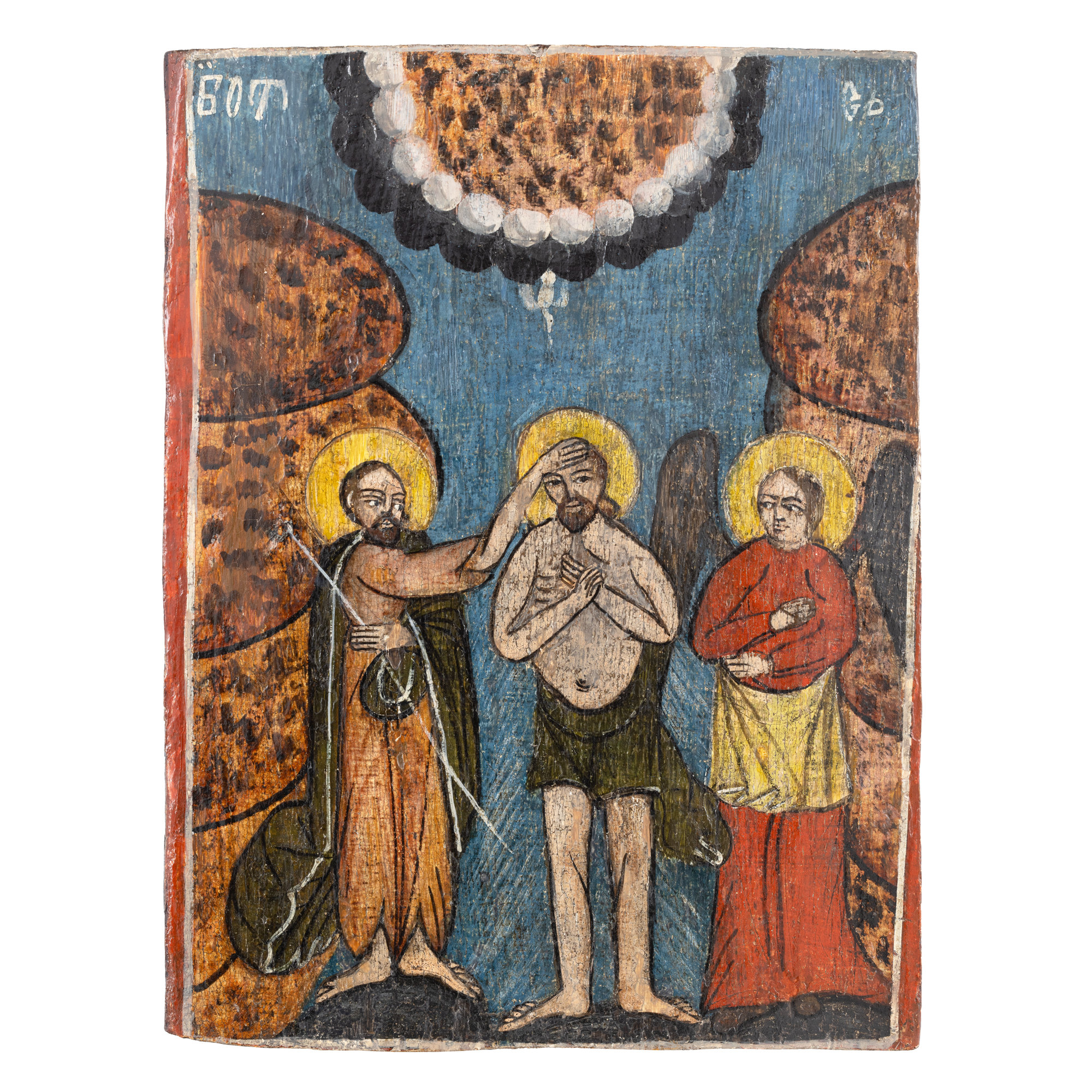 Elemente de identificare de ordin iconografic și stilistic: Icoana este un prăznicar și a făcut parte din friza unui iconostas, dintre care nouă icoane s-au păstrat în colecție. La icoana Botezul Domnului, zugravul respectă schema compozițională tradițională, însă o simplifică la elementele esențiale. În centrul compoziției, în ax de simetrie, este redat Iisus în picioare, în apa Iordanului. Pe malul stâng, Sfântul Ioan Botezătorul îl botează, iar pe malul drept, în picioare, este redat un înger. Malurile râului sunt redate fantezist, la fel și cerul deschis, din care se pogoară Porumbelul Duhului Sfânt. Calitățile stilistice și cromatice sunt similare cu cele ale icoanelor precedente. Elemente de identificare de ordin tehnic: Suportul din lemn al picturii este format dintr-un blat fără traversă. Concluzii: Pictura icoanei se încadrează stilistic în pictura religioasă, așa cum era practicată în atelierele locale de pictură de către zugravi mai puțin școliți, pictură care treptat se va transforma în pictură populară (A.D.).