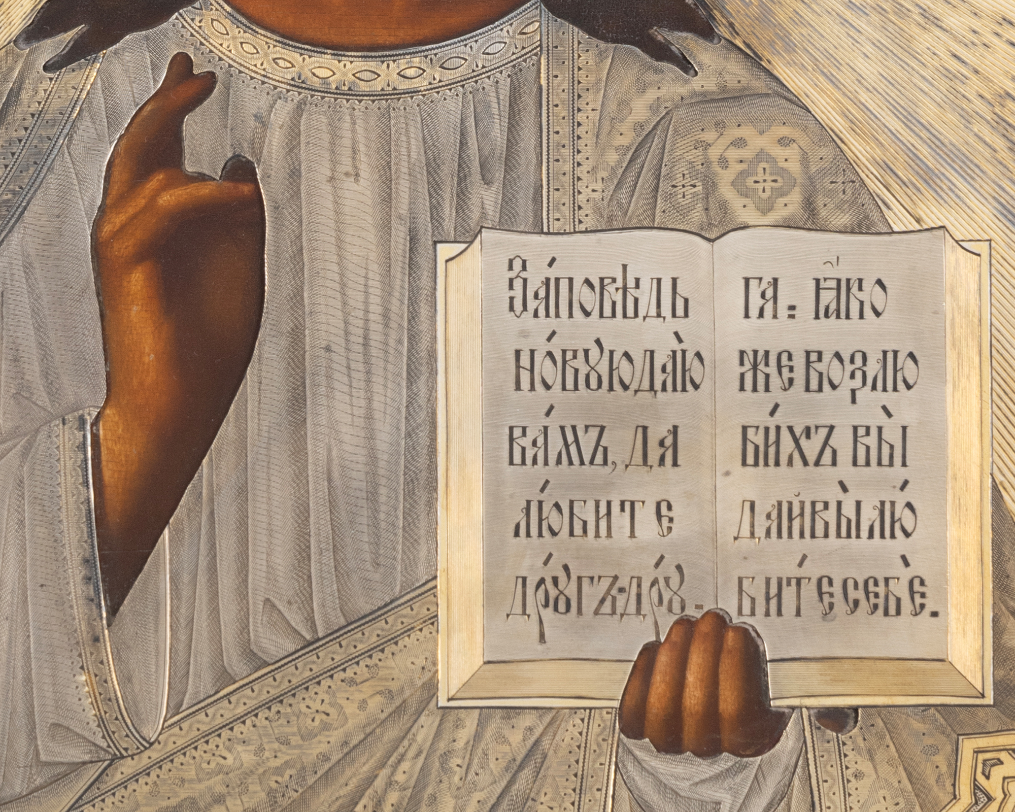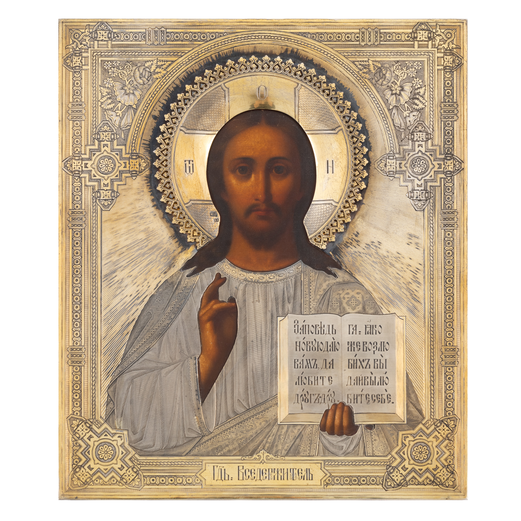 71. Icoană pe lemn, cu ferecătură din argint aurit, ”Iisus Pantocrator”, școală rusească, 1882, piesă de colecție