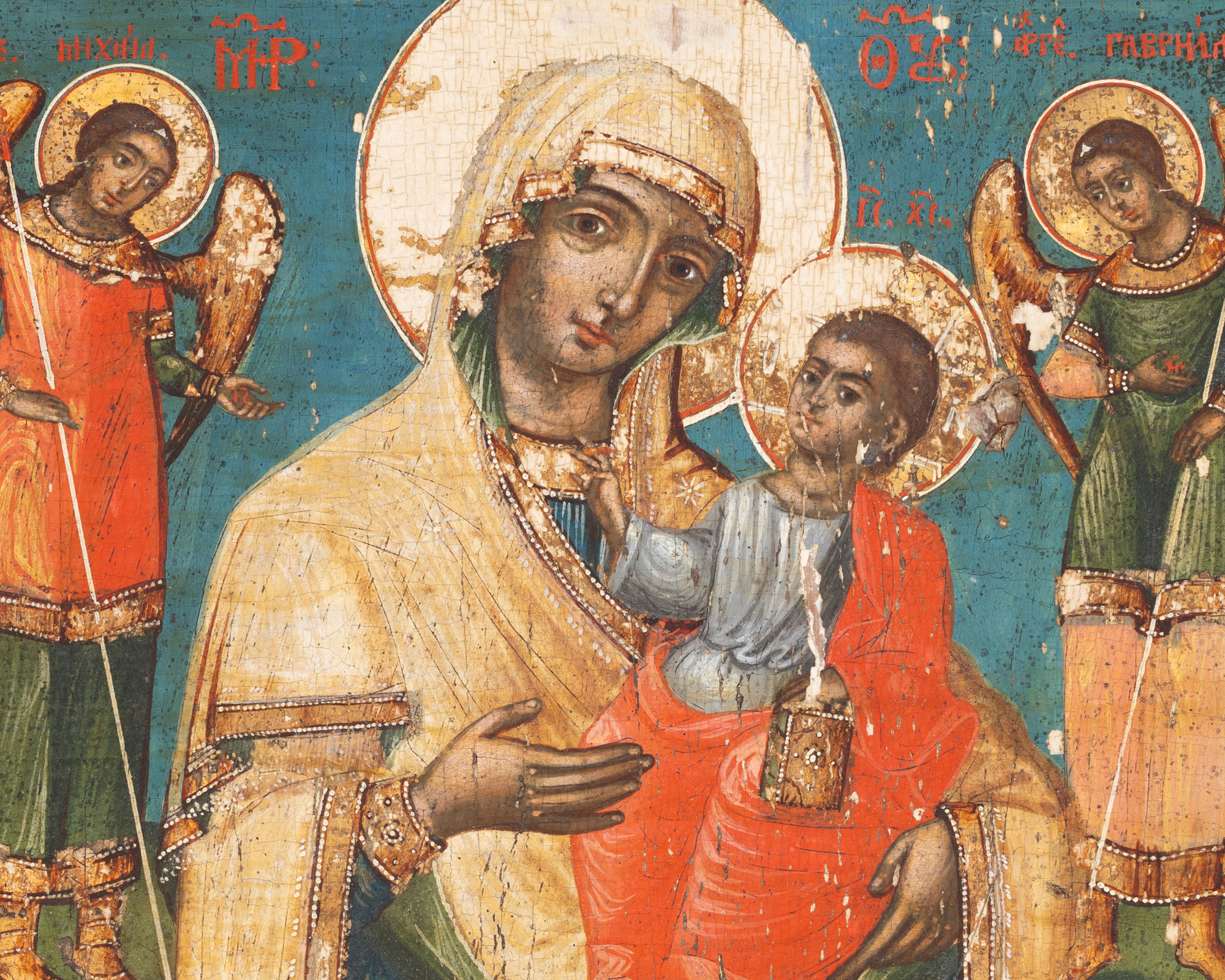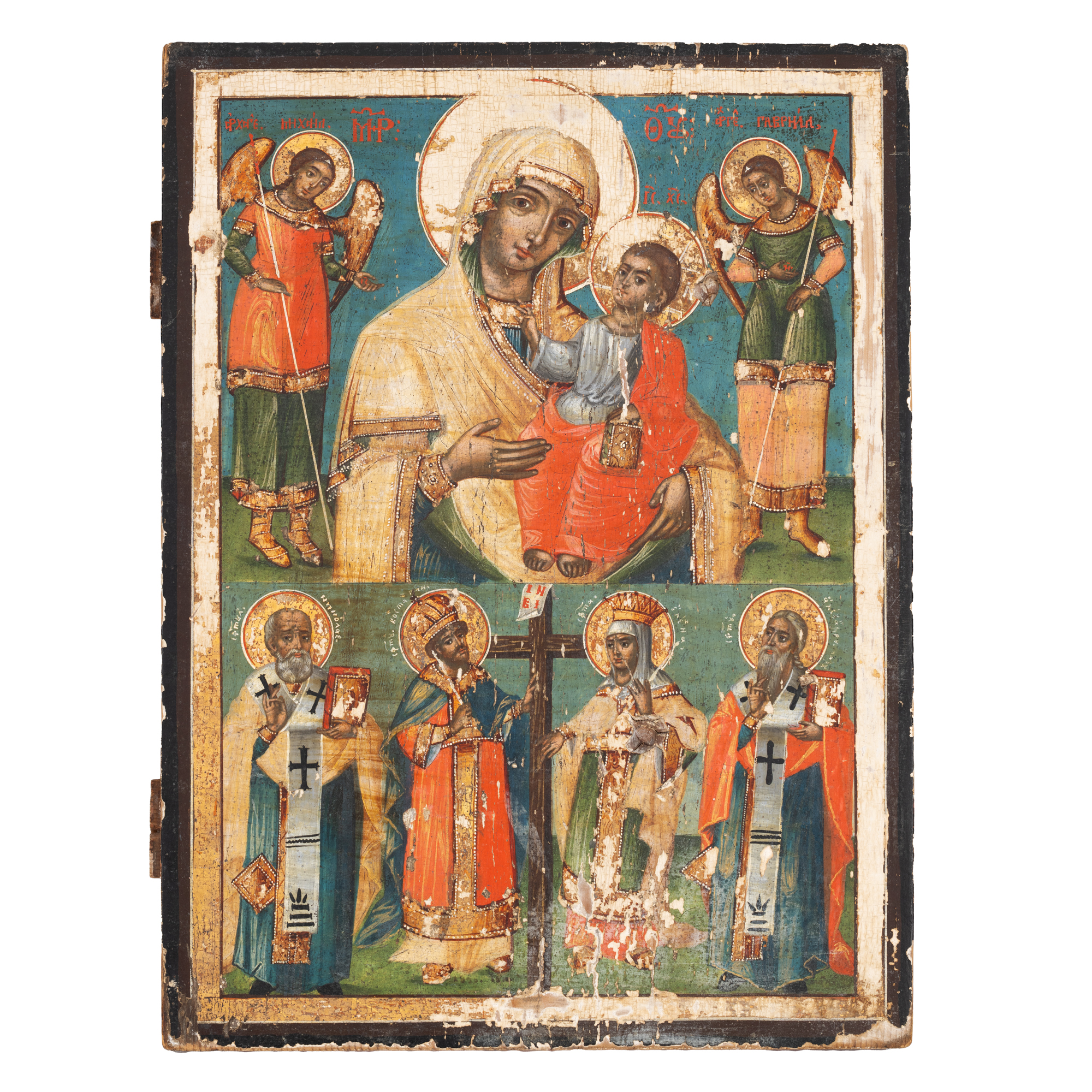 Elemente de identificare de ordin iconografic și stilistic: Este o icoană în două registre. În registrul superior este redată până la brâu Maica Domnului ținând Pruncul în brațe – tip Hodighitria. Este flancată de Arhanghelii Mihail și Gavriil, redați în picioare. În registrul inferior sunt reprezentați în picioare Sfinții Împărați Constantin și Elena, susținând Crucea, simbolul creștinismului, având la stânga pe Sfântul Ierarh Nicolae și la dreapta, posibil, Sfântul Ierarh Andrei Criteanul. Fondul icoanei este albastru, iar nimburile și chenarul icoanei sunt executate cu aur. După compoziția scenelor, modelarea chipurilor și execuția drapajului veșmintelor, pictura icoanei poate fi atribuită unui atelier din Moldova, în jurul anului 1830, conform datării icoanei. Elemente de identificare de ordin tehnic: Suportul de lemn al icoanei este format dintr-un singur blat, întărit pe verso cu două traverse semiîngropate. Concluzii: Pictura icoanei, din punct de vedere tehnic și stilistic, se încadrează în faza de tranziție a picturii tradiționale către pictura occidentală, însă anumite particularități o situează în școala de pictură moldovenească, cu vizibile influențe ale școlii grecești contemporane (A.D.).