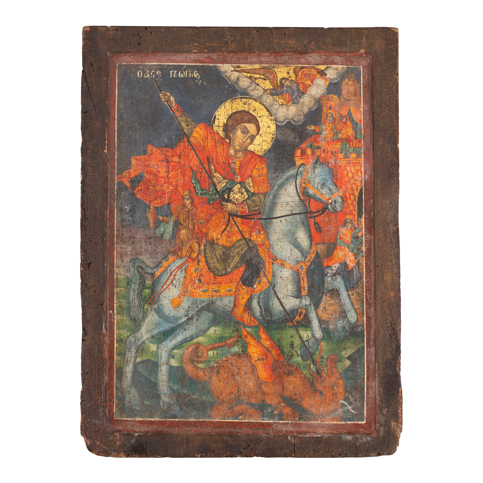 46. Icoană pe lemn, ”Sfântul Gheorghe omorând balaurul”, școală grecească, sfârșitul sec. XVII-începutul sec. XVIII