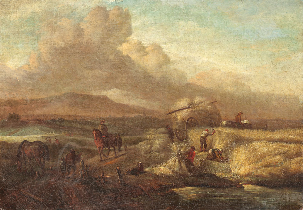 Philips Wouwerman a fost unul dintre cei mai prolifici artiști plastici ai Epocii de Aur olandeze. Wouwerman s-a născut în Haarlem, oraș cunoscut ca având un mediul artistic dezvoltat. El a adus o contribuție importantă și extrem de influentă asupra canonului existent la acea vreme în pictura olandeză. Picturile sale au început să fie apreciate mai ales începând cu secolul al XVIII-lea. Potrivit lui Cornelis de Bie, Wouwerman l-a avut ca profesor pe Frans Hals, dar stilul acestuia din urmă nu se regăsește în pictura lui. În afară de scurta ședere în Hamburg, la sfârșitul anilor 1630, artistul și-a dezvoltat întreaga carieră numai în Haarlem, alăturându-se totodată și breslei meșteșugarilor Sfântul Luca. Wouwerman și-a început cariera artistică cu reprezentări simple ale vieții de zi cu zi, în maniera bamboccianti al lui Pieter van Laer. De-a lungul următorilor treizeci de ani el a dezvoltat un stil individual, tratând o gamă largă de subiecte de gen și peisaje până la scene militare și religioase (scene de vânătoare, ecvestre, peisaje cu călători, lupte de cavalerie și festivități ale țăranilor etc). Chiar dacă este recunoscut drept cel mai valoros și de succes pictor de tematici ecvestre din secolul al XVII-lea, Wouwerman a excelat și în compozițiile în peisaj, purtând într-o manieră proprie tradiția flamandă a peisajului rural. Opera de față se devoalează într-o compoziție tipică artistului pentru anii 1640, mai ales datorită specificațiilor peisajului, dar și cele ale semnăturii. Folosirea monogramei din 3 litere (p, h, w) plasează uleiul de față până spre 1646, însă elementele de periodizare răzbat și din construcția peisajului. Operele din acea perioadă erau mai mereu compuse printr-un joc perspectival între dealul sau muntele din fundal și scena din prim-plan, ce trebuia întotdeauna să conțină un cal - drept element de balans compozițional.