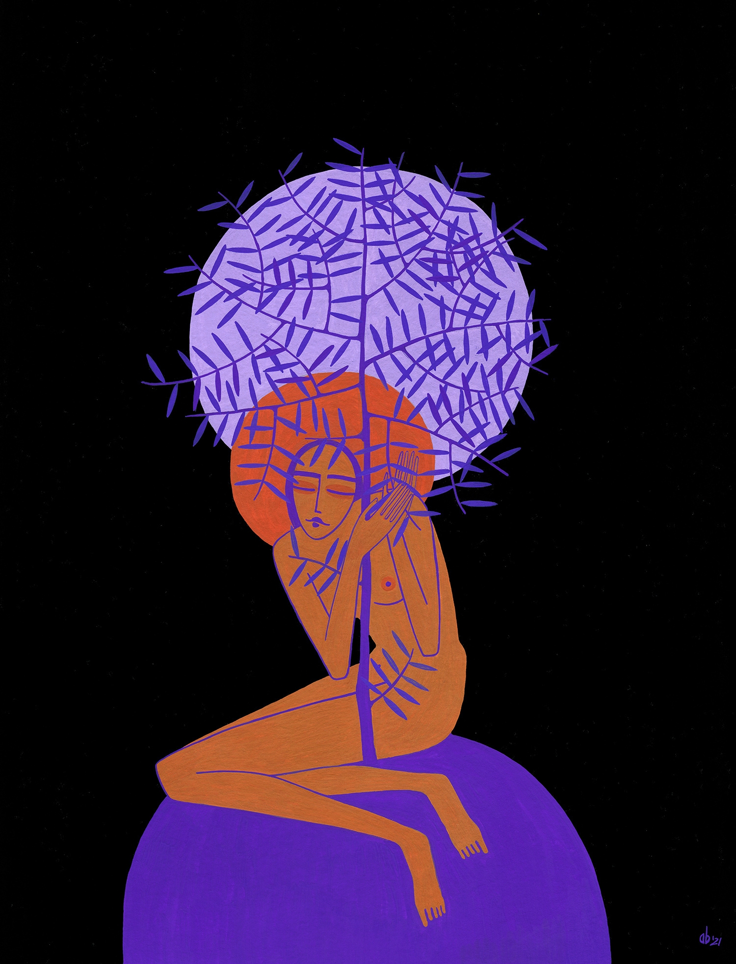 semnat dreapta jos, cu mov, "AB, (20)21"; semnat, datat și intitulat pe verso, în creion, "AB, 2021, Blue Moon"