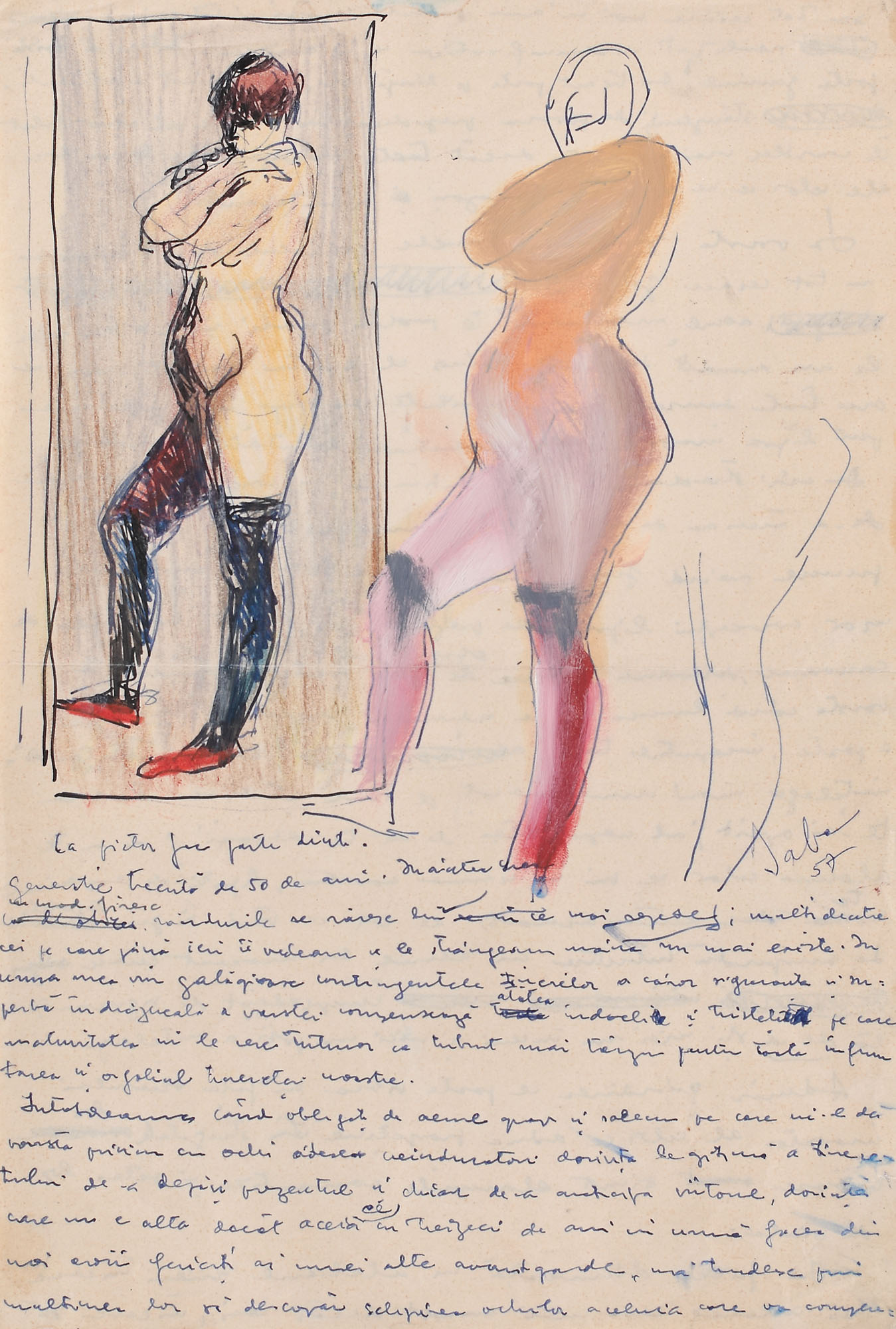 semnat și datat lateral dreapta, cu albastru, "Baba, (19)57"