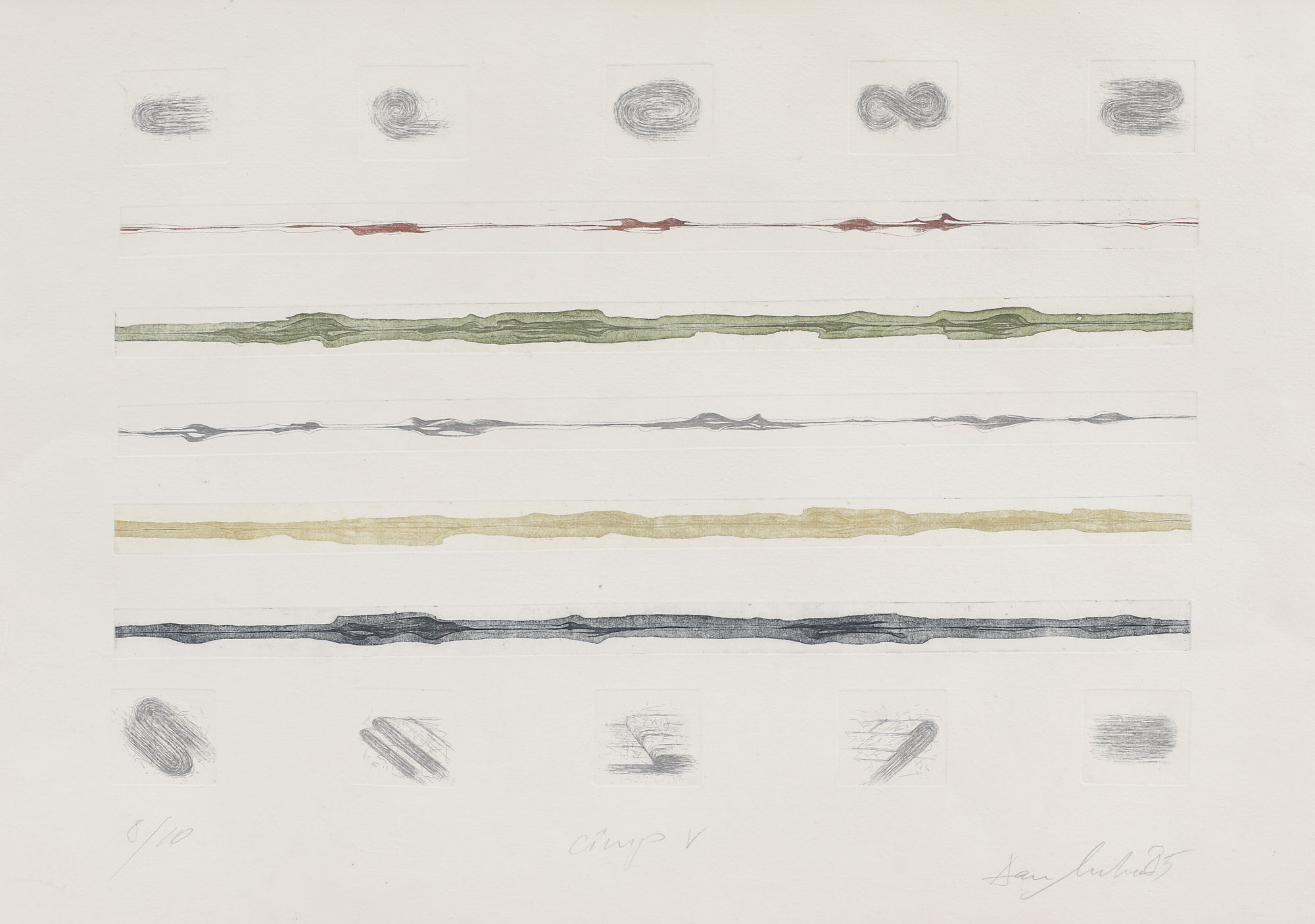 semnat şi datat dreapta jos, în creion, "Dan Mihălțianu, (19)85"; intitluat central jos, în creion, "Cîmp V"; numerotat stânga jos, în creion, "8/10"