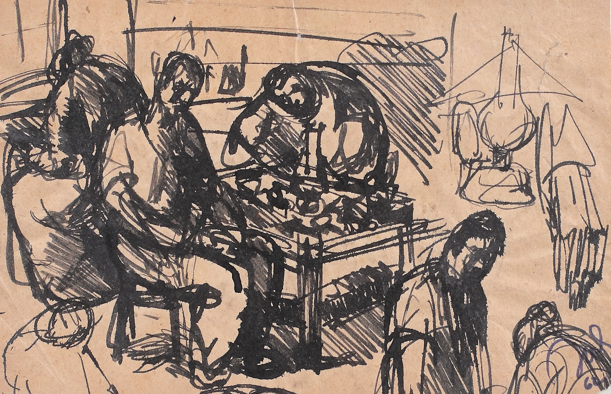 tuș și peniță pe hârtie lipită pe carton