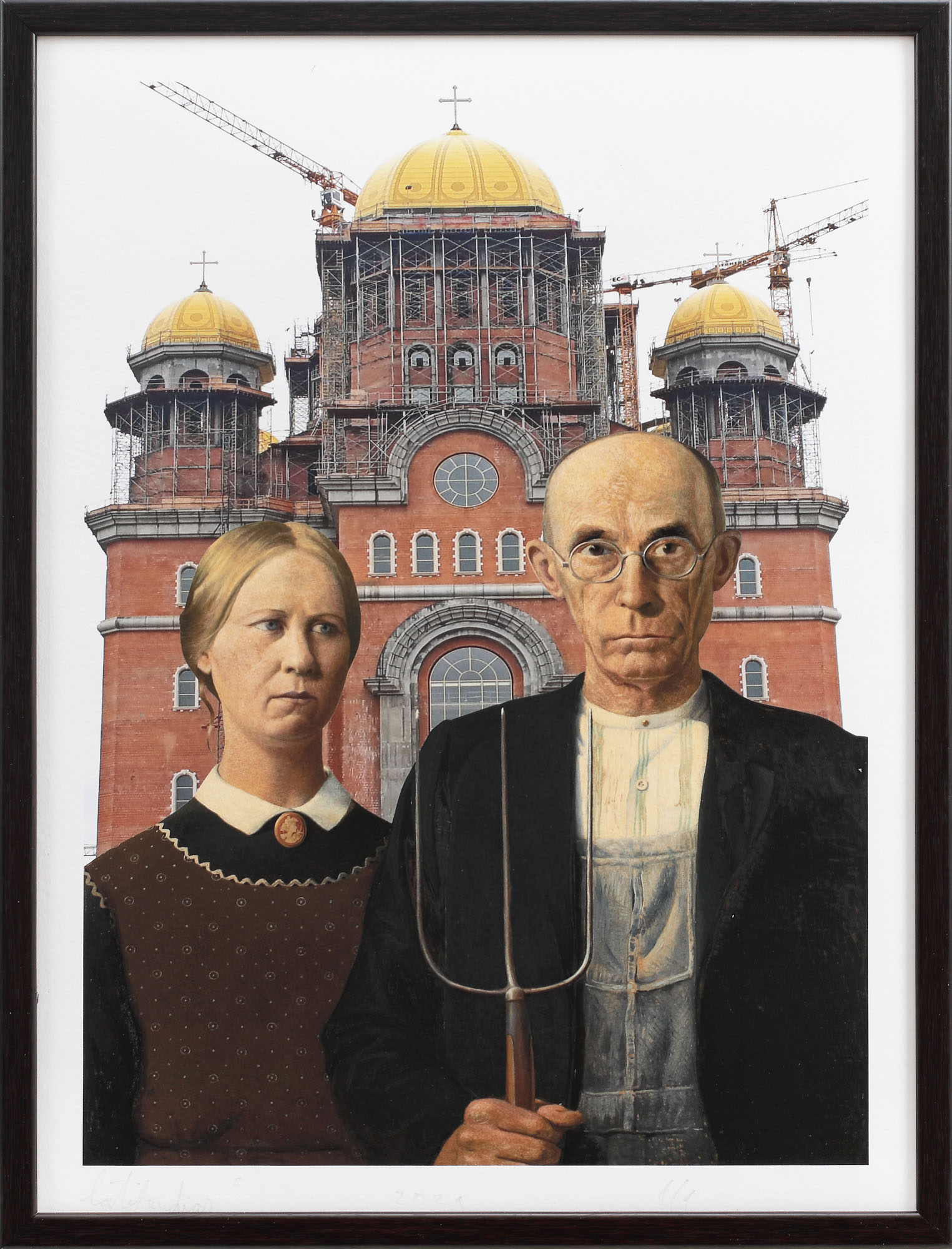 Lucrarea "American Gothic" este una din cele mai reproduse lucrări de artă din istorie și una din cele mai cunoscute picturi americane. De-a lungul timpului, imaginea a fost satirizată sau preluată de mai multe ori, pentru diferite scopuri, inclusiv reclame și benzi desenate. Asocierea unei imagini atât de populare în cultura americană cu clădirea simbol a Bisericii Ortodoxe din România este, cel puțin la prima vedere, neobișnuită.ÎIn timp ce fenomenele caracterizate prin conflicte devin înghețate în practica nemărginită și rudimentară, privitorul este lăsat cu un testament al condiției umane: efemeritatea.
