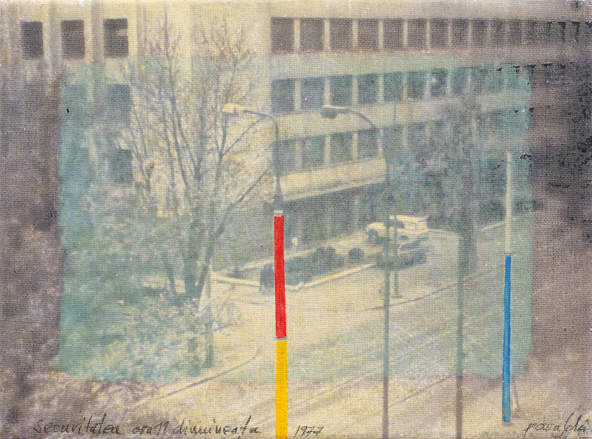 semnat dreapta jos, cu negru, "Paraschiv"; intitulat şi datat stânga jos, cu negru, "Securitatea, ora 11 dimineaţa, 1977"