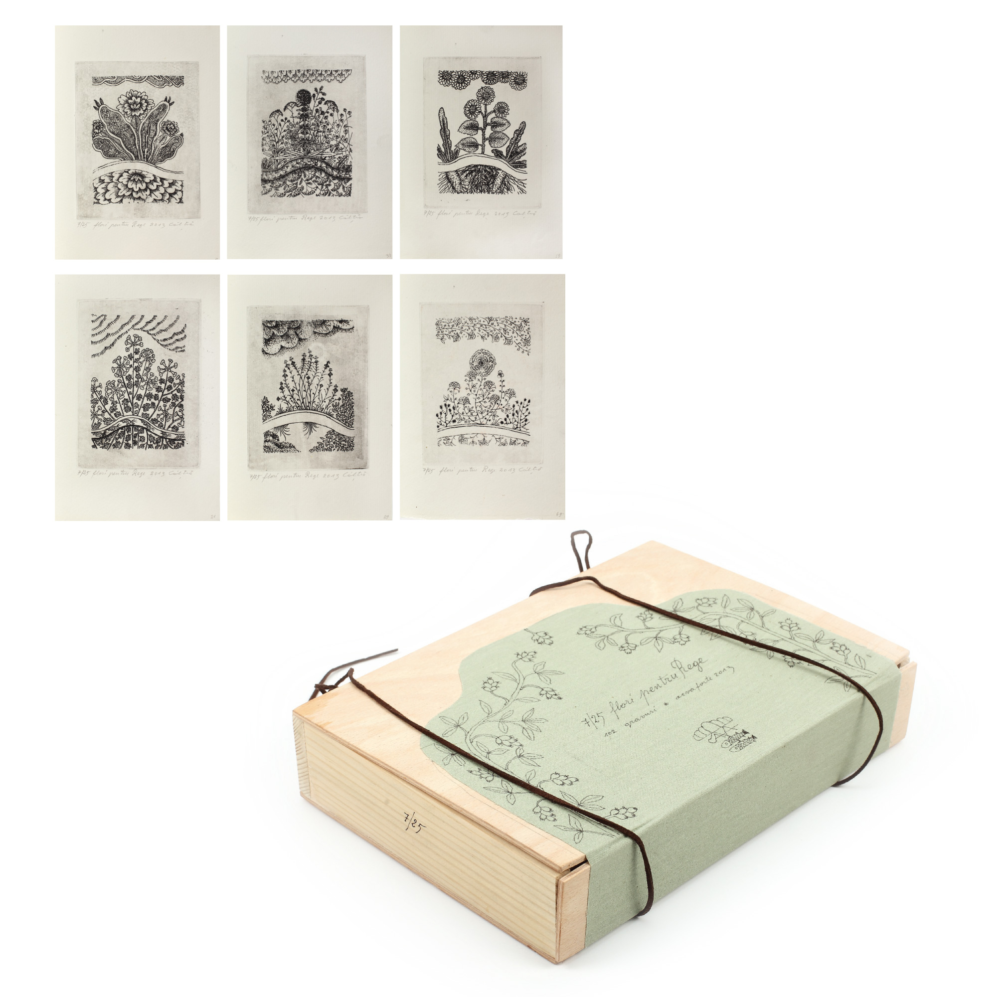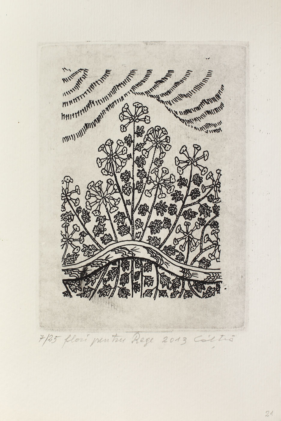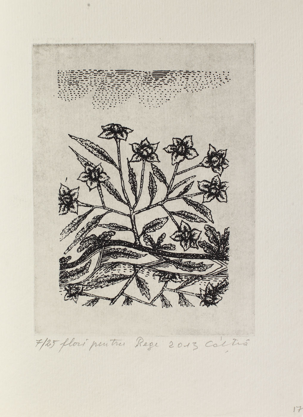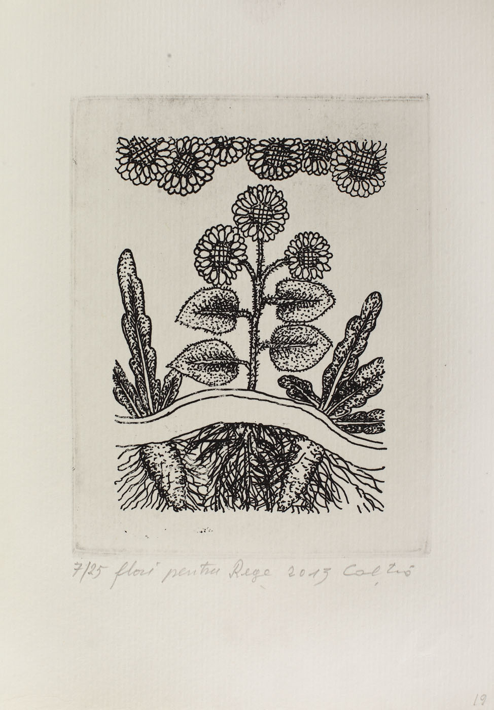 semnat, datat, intitulat şi numerotat central jos, în creion, "Câlţia, 2013, Flori pentru rege, 7/25"