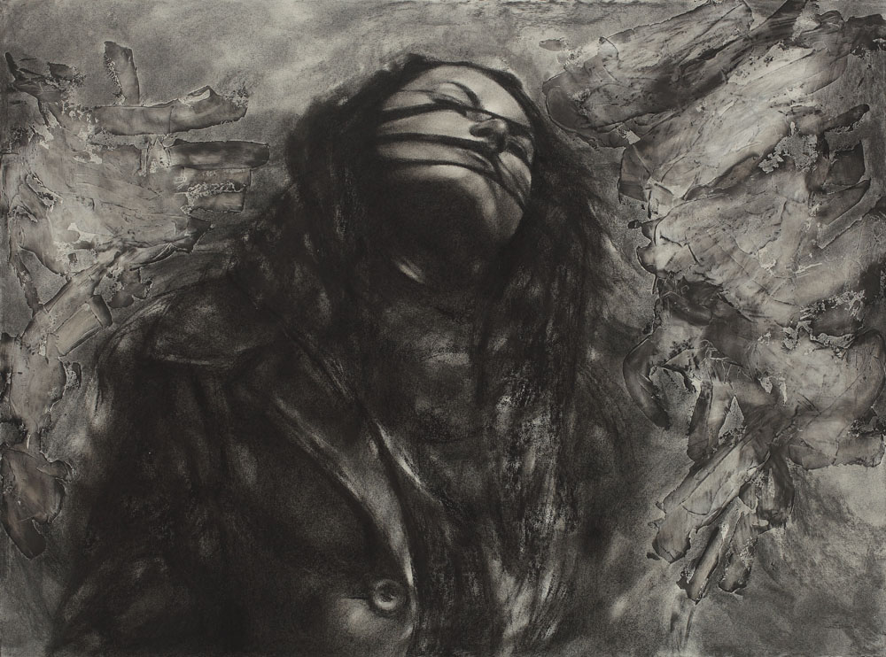 cărbune, estompă şi accente de acrilic pe hârtie
