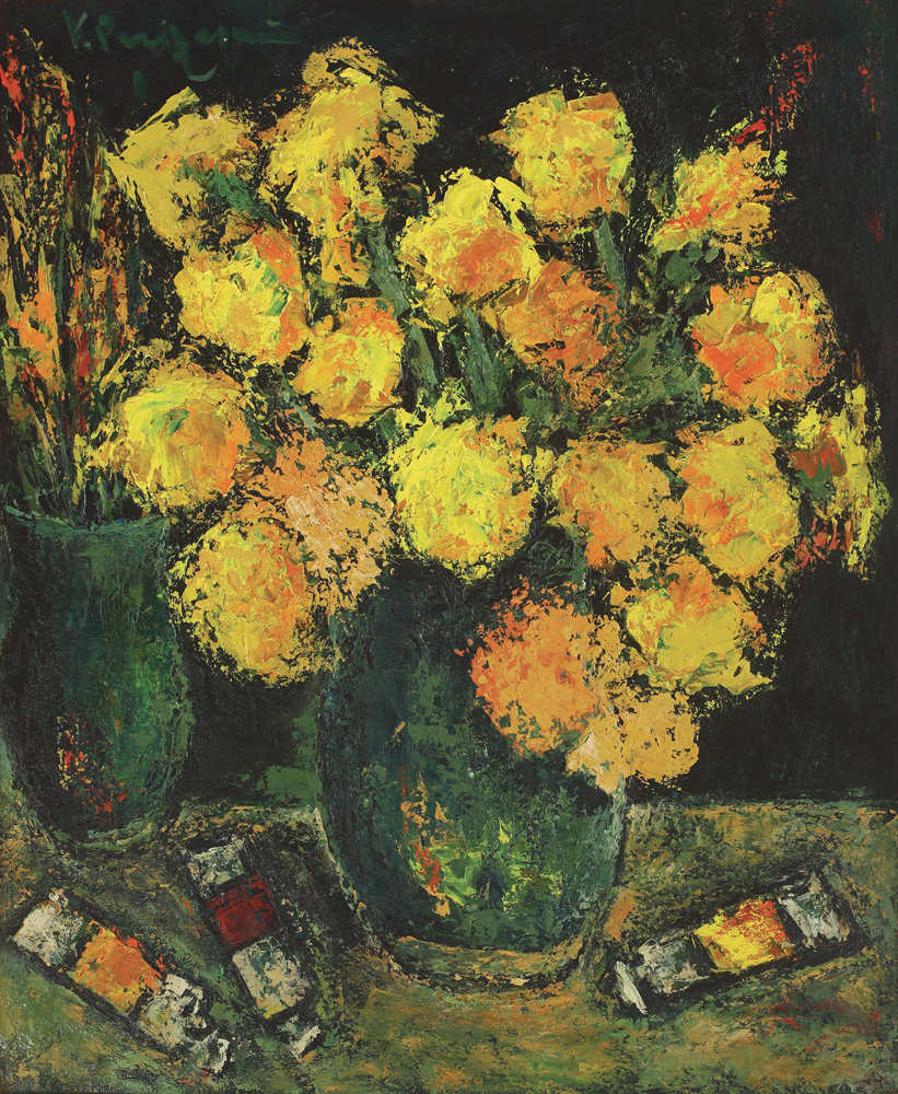 Pe verso mențiunea: “Flori, florile galbene, luminoase, tensionate, dar de ce sunt aşa de galbene? Tuburile, multe, ale pictorului, nu lipsesc niciodată din naturile statice. Ele nu sunt <<naturi moarte>>, cum ne spun ei, sunt vii, da, vii! Trebuie să fie vii şi să trăiască o veşnicie. Îmi place. Nu ştiu, parcă ar mai fi trebuit ceva. Dar ce?” V. Parizescu, ianuarie 1993