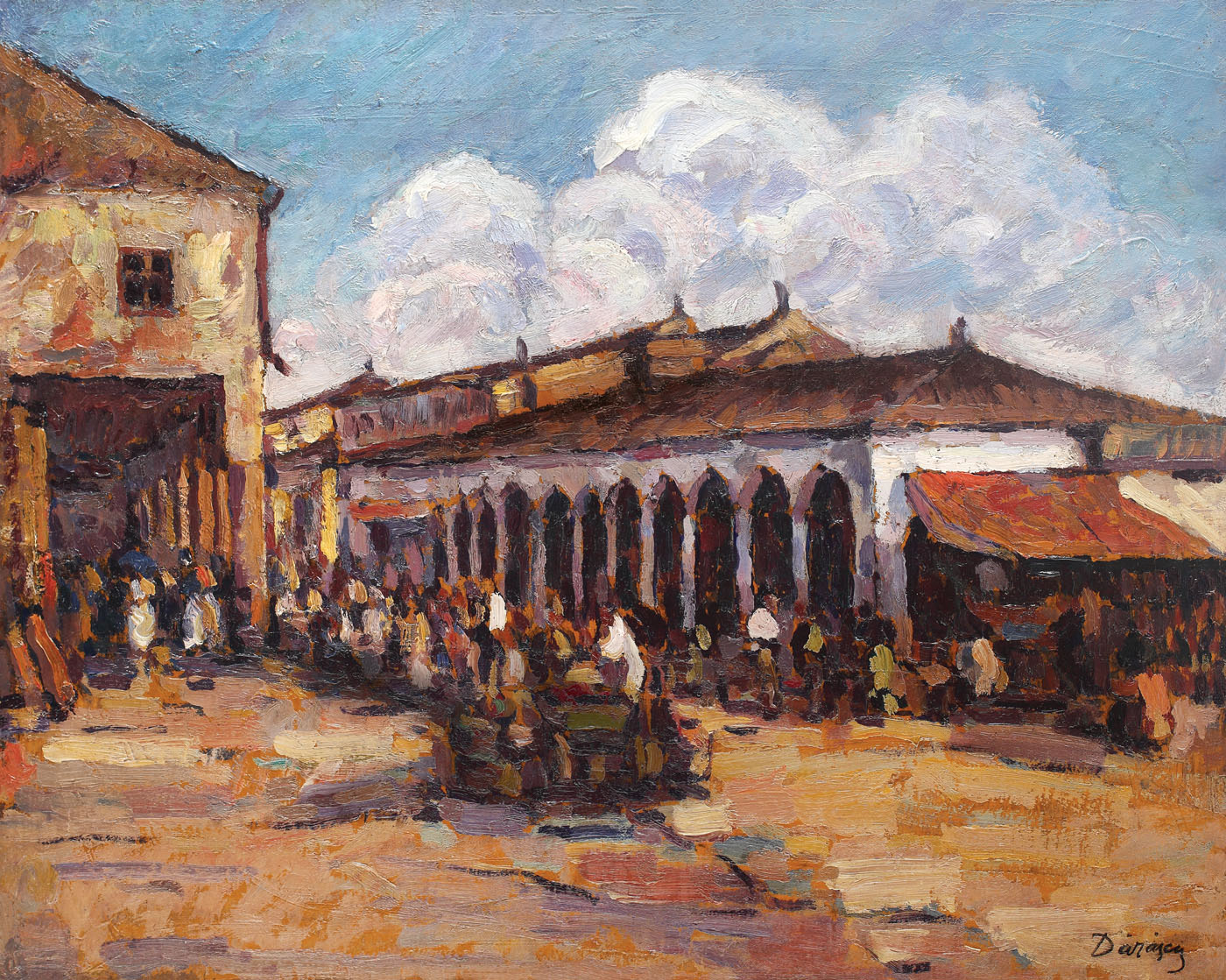 Timp de 10 ani, în perioada 1919 -1929, Dărăscu va pendula între zona de coastă dobrogeană, Delta Dunării și Veneția. În 1924, la expoziția personală organizată la sala Mozart, se remarcau viziunile ample, cuprinzătoare, fie în maniera impresionistă, ce scufunda fundalurile și marca prim planurile prin tușe moștenite din divizionism, fie în maniera-i specifică, în care structuri­le erau construite din mase de culoare cu contururi precise. Geografia și mediul deltei sunt cele care îi schimbă paleta, apropiindu-i nuanțele de gri, în care se reflectă albastrul cerului sau verdele stufului. Revenirile succesive ale pictorului în aceste zone reprezintă tot atâtea schimbări de optică asupra motivului. Dărăscu revine cu prospețime asupra peisajelor din zonele îndrăgite, abordând noi probleme stilistice ori compoziționale. Însă una dintre cele mai interesante maniere de abordare a diverselor vedute pe care le-a analizat și reprodus Dărăscu nu constă în această revenire cronologică, sezonieră, ci în revenierea iconografică. Repetarea unui motiv în exercițiul pictural devine astfel o abordare specifică a lui Nicolae Dărăscu, scrutinarea operei sale picturale dezvăluind anumite imagini ce se detașează de întreg corpul artistic, devenind, ușor paradoxal, unice. Instituția “variantei” - așa cum istoria artei se raportează la alte opere cu același subiect ale aceluiași artist - devine astfel un subiect de sine stătător în cazul pictorului nostru. Maniera nu este nici pe departe proprie, ci este o interpretare ulterioară a manierei plăsmuite de impresioniști începând cu a doua jumătate a secolului al XIX-lea. Sunt binecunoscute variantele lui Claude Monet, punct de start și reper incontestabil fiind celebra “Impresie. răsărit” pictată începând cu 1872 în portul Le Havre. Componenta cea mai importantă în cazul impresioniștilor și apoi a urmașilor (Dărăscu fiind pe linia directă a neoimpresioniștilor) este experimentul cromatic și variația de lumină. Variantele apar astfel dintr-un exercițiu de paletă, nu neaparat de compoziție, variațiile de lumină fiind expresiv punctate cromatic. Opera de față, dincolo de aspectele evidente ale pitorescului figurativ, ale unei palete excepționale și a unei compoziții structure atent, poartă și o componentă documentară importantă, întregind un mini ciclu cromatic al pieței din Tulcea, alături de celelalte 2 variante cunoscute - Muzeul Național de Artă al României (inv. nr. 6941) și Muzeul de Artă Tulcea (inv.nr. 37). (I.P.)