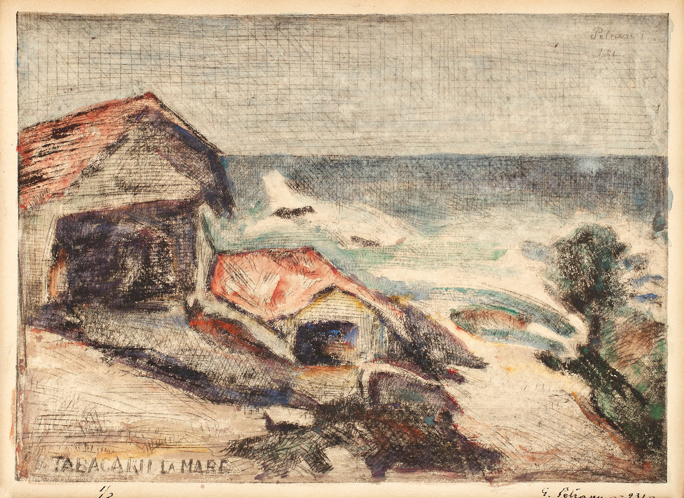 semnat şi datat dreapta sus, în placă, Petraşcu,(1)931; semnat şi datat dreapta jos, în peniţă, G. Petraşcu, (1)931; intitulat stânga jos, în placă, TĂBĂCĂRII LA MARE; numerotat stânga jos, în peniţă, 1/2