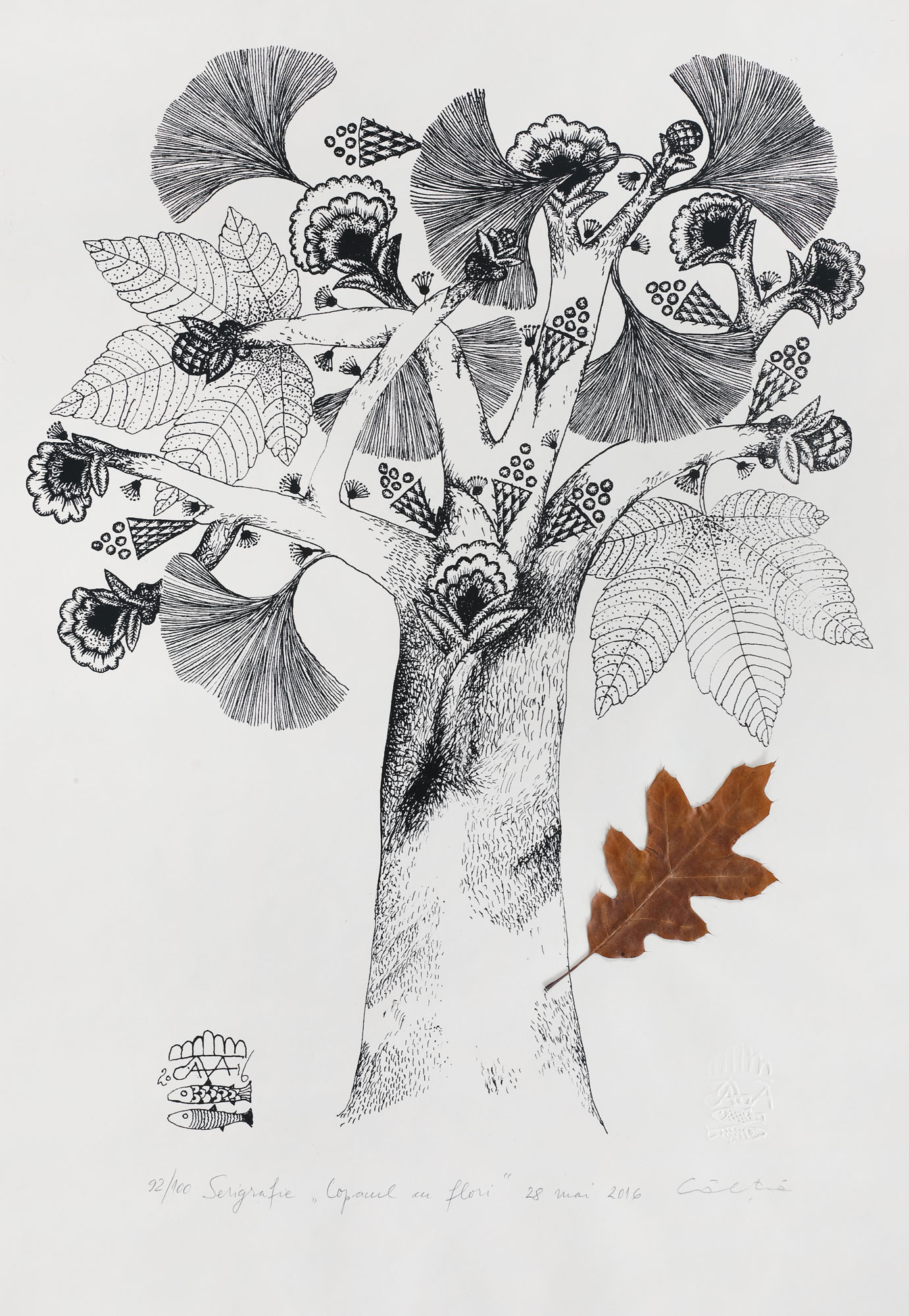 semnat și datat stânga jos, în placă, ”Câlția, 2016”; semnat, datat, intitulat, numerotat și notat central jos, în creion, ”Câlția, 28 mai 2016, Copacul cu flori, 92/100, serigrafie”