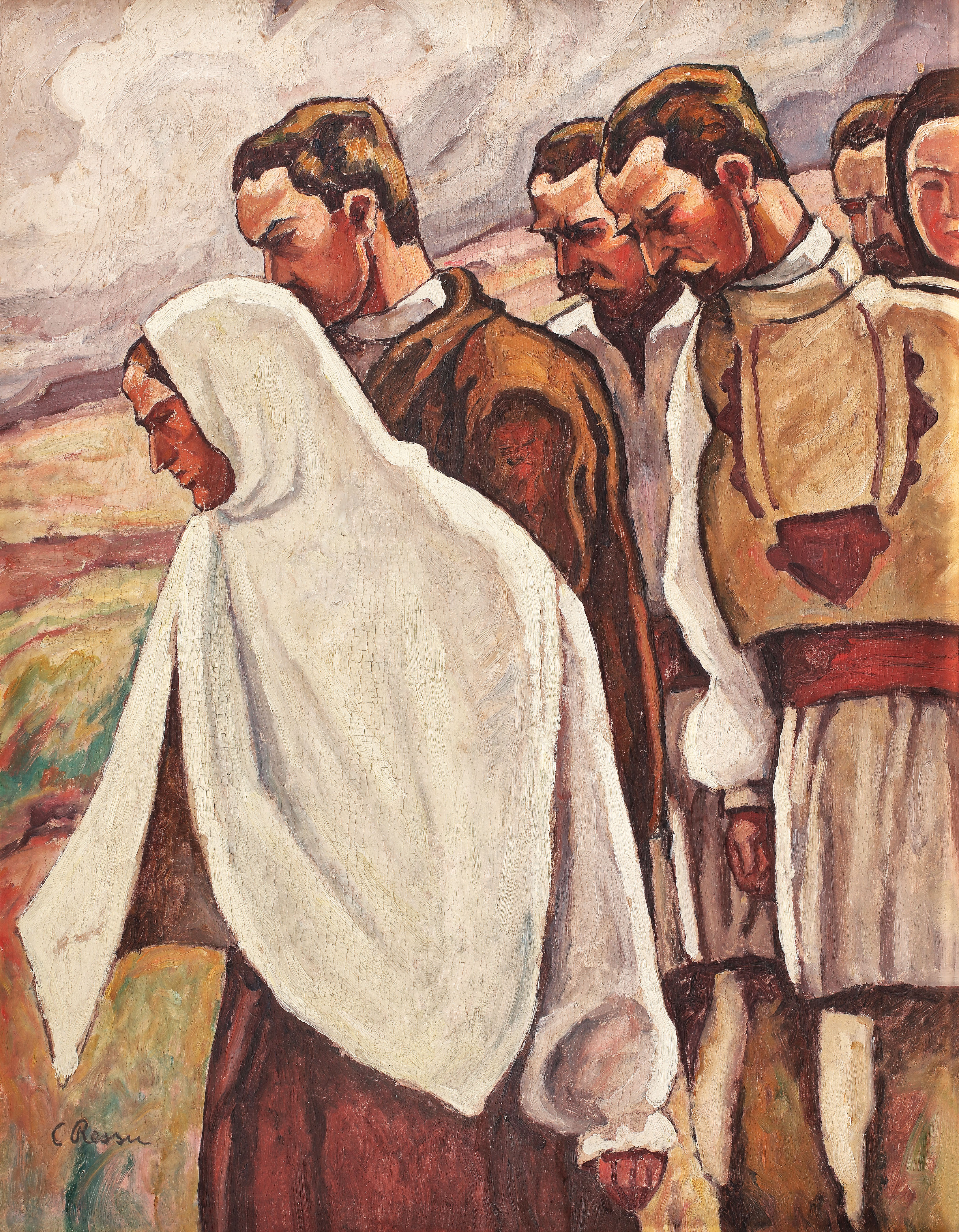 În 1912, Camil Ressu prezenta la Salonul Oficial prima mare compoziție cu accente decorativ-monumentale, "Înmormântarea la țară" (titlul original, din catalogul salonului, a fost "O înmormântare"). Acest tip de operă avea să deschidă calea unor compoziții la fel de celebre, ca "Academia Terasa" sau "Odihna câmpului", ca să nu mai vorbim de proiectul pentru copertina Teatrului Național din București. În cazul "Înmormântării la țară", problematica apariției ei în imaginarul lui Ressu ține de accesarea și asimilarea motivului rural într-o manieră total disociată față de ceea ce obișnuise pictura lui Grigorescu și a epigonilor săi. Chiar dacă suscită în epocă reacții diverse, atât pro cât și contra, opera îl delimita definitiv pe Ressu în comparație cu sămănătoriștii clasici, care alegeau încă reprezentări idilice ale țăranului român. Însăși sursa de inspirație a lui Ressu – marea compoziție a lui Lucien Simon, "Procesiune bretonă" – deschidea un orizont de inovație pe care Ressu îl anunțase încă din 1909, începutul perioadei Vlaici. Compoziția finală (198 x 249 cm) avea să cunoască o serie de compoziții-studiu, monumentala creație fiind axată pe diversitatea și apariția inedită a chipurilor îndurerate ale țăranilor. Dacă în această operă Ressu avea să integreze numai puțin de 16 personaje, care primesc apoape toate propriile trăsături de portret, ne putem imagina necesitatea unor studii compoziționale multiple. Opera de față surprinde grupul de țărani din partea stângă a compoziției finale, parte extrem de interesantă căci ea cuprinde și singurul personaj feminin (în întregime) din opera finală. Personaj central, țăranca din prim plan coordonează vizual întreaga operă și este contrabalansată de apariția mult mai funebră a chipului din feminin din partea dreaptă, parțial tăiat, dar cu o privire pătrunzătoare, direct către privitor.