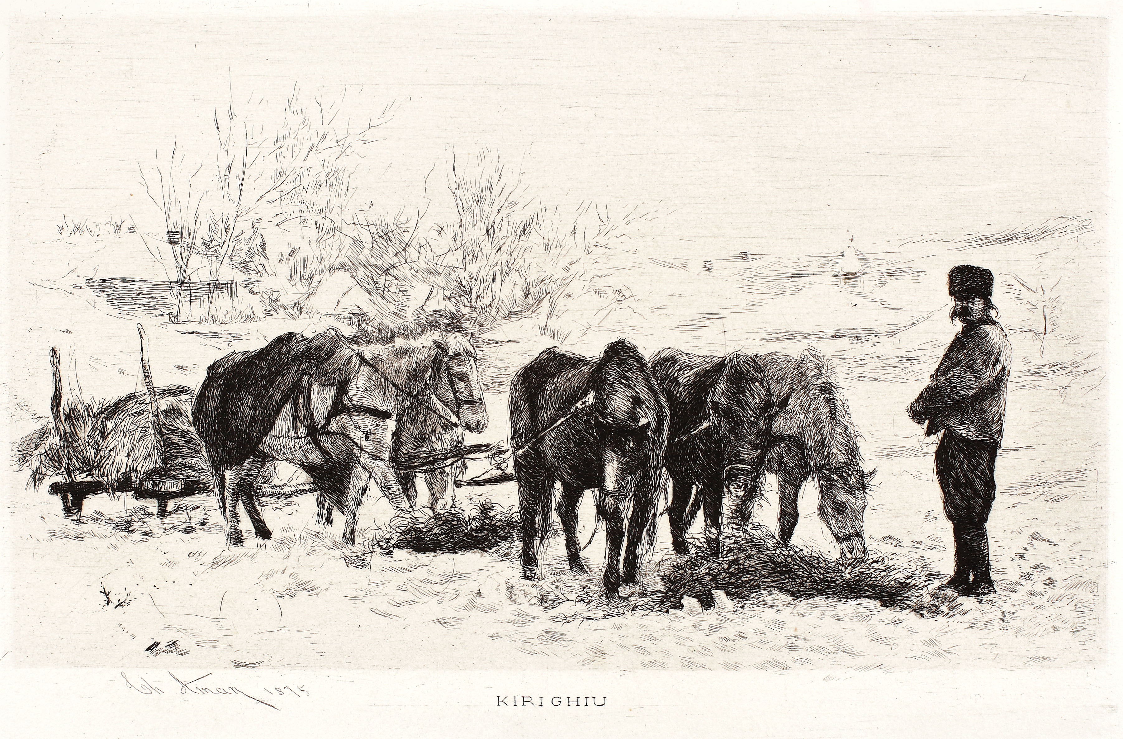 semnat şi datat, gravat, stânga jos, "Th. Aman, 1875"; inscripţie gravată, central jos, "KIRIGHIU"; inscripție gravată dreapta jos, "IMP. AUTORULUI"