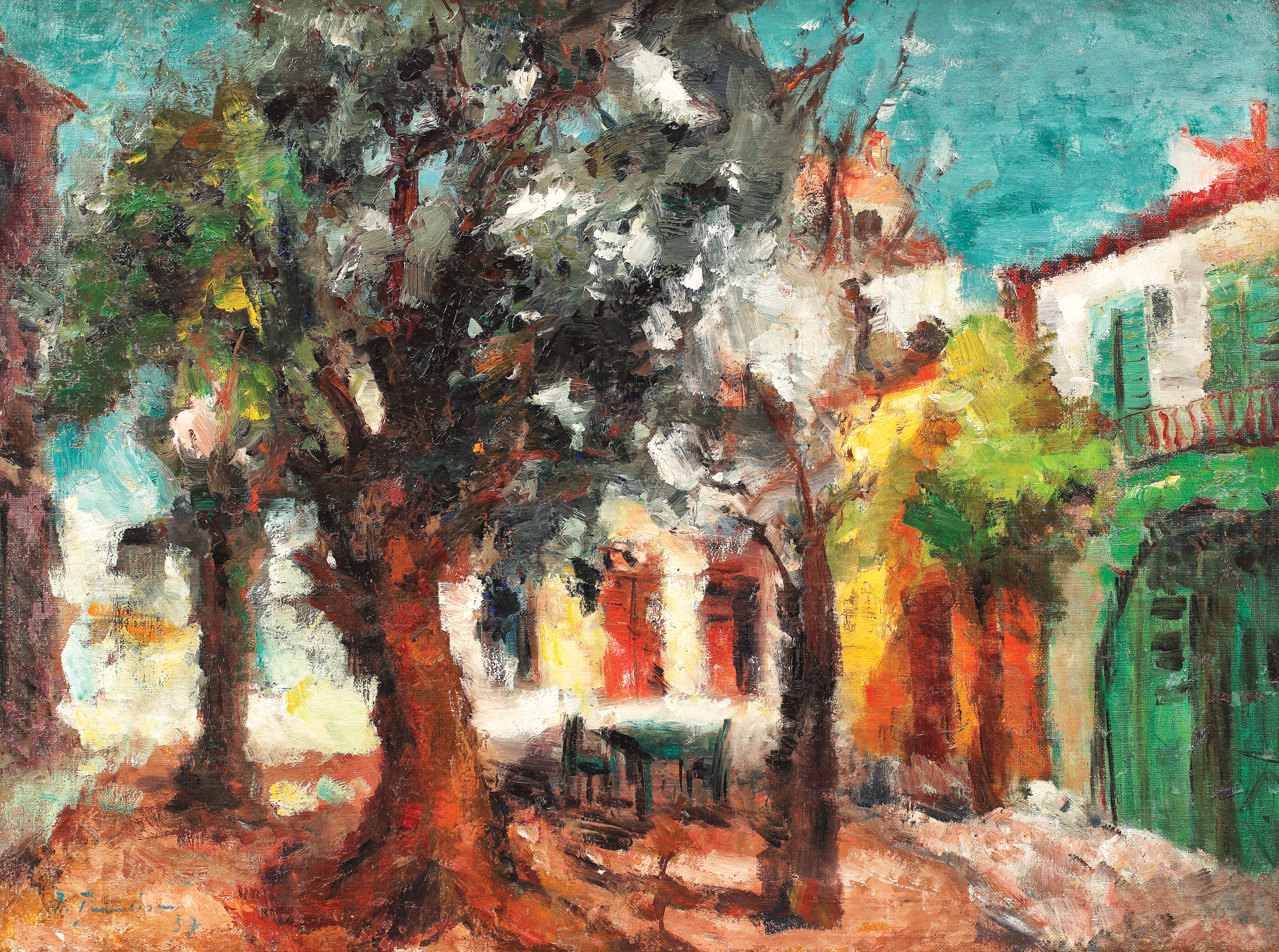 Perioada 1934-1938 marchează anii în care tânărul Țuculescu, student încă la facultățile de Medicină și Științe Naturale, se reapuca de pictură, cea care îl atrăgea atât de mult în anii copilăriei și adolescenței. În buna tradiție a pictorului peisagist, călătoria a reprezentat factorul decisiv în reluarea și interpretarea în limbaj pictural a lucrului văzut, fapte inițiat totuși la rugămintea Mariei Fotiade (soția artistului, începând cu 1934. Turcia și Grecia, descoperite în acel prim voiaj, vor reintra în vizorul artistului câțiva ani mai târziu, de astă dată peisajele devenind cu adevărat creații ale unui pictor desăvârșit. Aceasta este perioada în care peisajul devine motivul preferat al lui Țuculescu și, chiar dacă stilul se modifică, perspectiva și orizontul, tipice unei vederi, vor persista și în “încâlcita” perioadă expresionist-abstractă. Revenind la perioada ce ne interesează direct, putem trage câteva concluzii în privința artei pe care o practica Țuculescu în perioada 1937-1938 și prin prisma cronicilor ce i-au însoțit debutul expozițional, din mai 1938. Cei mai însemnați critici ai vremii aveau să se aplece asupra expoziției acestui “necunoscut” Țuculescu; astfel, George Oprescu, Petru Comarnescu sau Tache Soroceanu întrezăreau debutul unui mare pictor. În rândurile din “Adevărul literar și artistic”, Soroceanu, pictor și el, menționa: “E un debut surprinzător de frumos. De la primul contact cu lucrările sale putem spune că avem de a face cu un pictor în toată puterea cuvântului. D-l Ion Țuculescu nu-i numai un tânăr ce dă dovadă de avântul vârstei, construind nervos și puternic volumele, ci simte culoarea. Are o pastă strălucitoare, o claviatură dinamică cu armonii inedite și cu efecte ce răzbat metalic […].” Țuculescu prezenta atunci tot ce pictase mai bine în anii menționați mai sus - Balcicul, Mangalia, vedute din Corfu și imagini din sudul Franței - exprimând cu adevărat trăirile unui peisagist postimpresionist, influențat atât de marii maeștrii ai impresionismului românesc, Andreescu și Luchian, dar poate și mai mult de arta lui Van Gogh, pe care o cunoștea la celebra expoziție retrospectivă din 1937, de la Paris. Peisajul de față, expus în prima expoziție personală (Ateneul Român, 1938) răspunde acestor influențe stilistice amintite, însă îl prezintă pe acel Țuculescu instinctiv, în care lipsa prejudecăților scolastice vibrează în pastă și în tușă. Regăsim motivul simptomatic al copacului, preluat din aprecierea purtată lui Andreescu, iar compoziția se desfășoară exemplar între raporturile de profunzime și perspectivă. Culoarea poartă încă paloarea impresionistă după care pictorul și-a compus peisajul perioadei de început, însă calitatea ei tonală pregătește nuanțele expresioniste pe care le regăsim în creația anilor ’40.