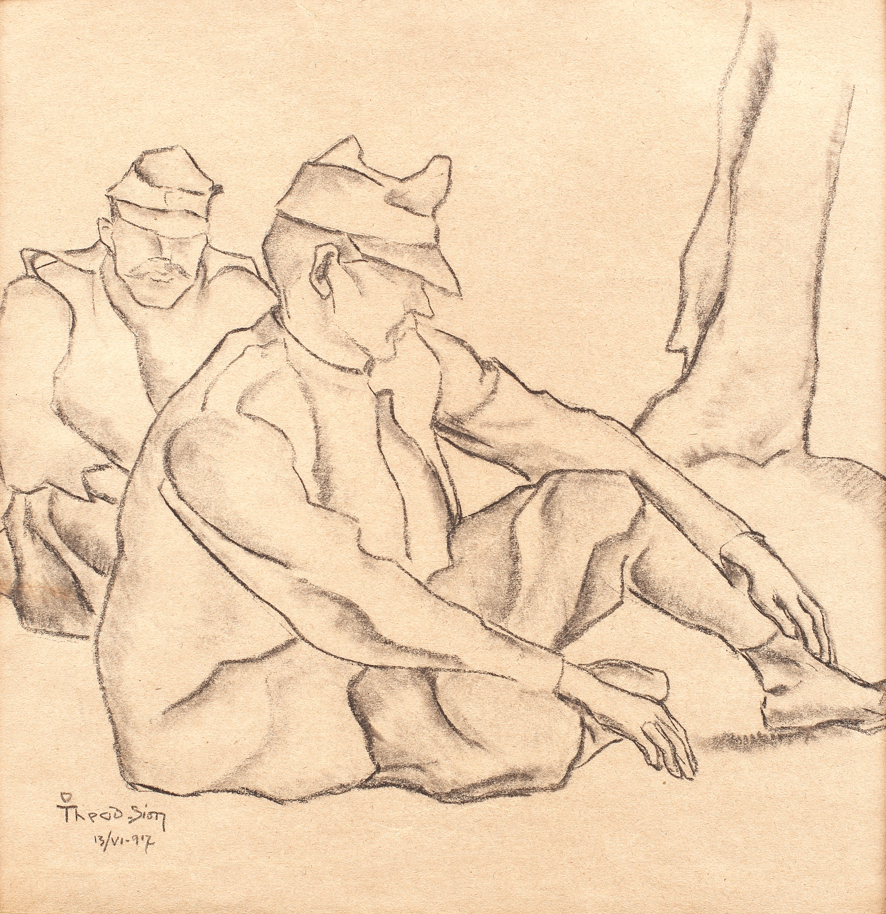 În urma circularei nr. 9400 din 23 iunie 1917 semnată de Generalul Constantin Prezan lua ființă secțiunea artiştilor - sculptori şi pictori - mobilizați pe lângă Marele Cartier General. Totodată se hotăra și crearea Muzeului Național Militar pentru amintirea și prezentarea eforturilor militare ale României. Theodorescu-Sion, artist implicat, aflat la a doua experiență de genul, după voluntariatul din timpul Războaielor Balcanice (1913), participa la luptele din Moldova, fiind și unul dintre artiștii care au lăsat în urmă opere create în timpul Primului Război Mondial. Aflat la Hlicea, unde s-a refugiat până la mobilizarea din 24 iunie 1917, Sion face o serie de desene ce surprind viața soldaților din spatele liniilor.