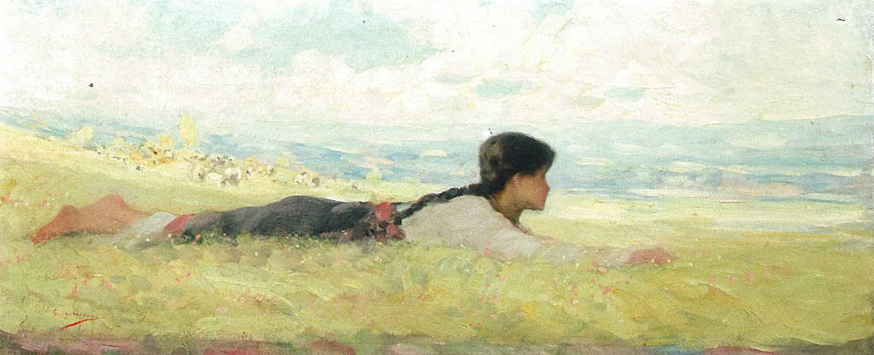 Paleta de alburi ce inundă întreaga scenă, izvorând din luminozitatea aproape orbitoare a cerului, vegetația în culori pastelate, trupul prelung și fin al modelului încadrează declarat această pictură în perioada albă, aproape de finele vieții artistului. Anul 1904 înscris de Grigorescu, confirmă datarea ce rezultă din viziunea și stilul imaginii. Scena redând un personaj feminin culcat în iarbă este o temă recurentă în opera lui Nicolae Grigorescu, temă ale cărei începuturi le putem găsi în "Nimfă în pădure" (probabil deceniile 1860-1870) , unde fondul de vegetație deasă contrastează intunecat, în spiritul Școlii de la Barbizon, cu luminozitatea degajată de trupul nud al personajului. Treptat, pe parcursul evoluției operei, tema este regăsită și decantată de Grigorescu în lumea rurală de la noi, modelele franceze fiind înlocuite cu tinerele țărănci cu trupul svelt ca lujerul, redate din profil, culcate în iarbă. Dacă în perioada de maturitate a stilului sau uneori în jur de 1895, Grigorescu insistă asupra culorii (iarba, basmaua roșie, succinte detalii vestimentare ; v. Păstoriță cu oi/Primăvara, Muzeul județean de artă Prahova, donația Seulescu-Stere; Pe pajiște, MNAR, inv. 69663/7603 ), punerea în pagină, respectiv încadrarea în peisaj a modelului rămâne aproape aceeași, în multele « variațiuni pe aceeași temă » pictate de artist cu precădere pe suporturi preferate, de format mic. Motivul fetei în iarbă face în perioada albă pandant cu un altul, cel al tinerei țărănci în picioare, cu siluetă prelungă, elegantă, pe fundal de peisaj, uneori cu fuiorul în mâini, precum schițele pentru coperta revistei Semănătorul. Este vorba despre o tipologie inventată programat și mereu afinată de Grigorescu, cea a Rodicăi, formulă de corp feminin elansat, ideal, pe care artistul o va fi considerat-o emblematică pentru arta românească în căutare de afirmare identitară. Reluarea în serie a motivului fetei culcate în iarbă a însemnat în mod evident pentru Grigorescu ocazia unor variate exerciții pe tema luminii, ce pot fi considerate ca și ansamblul picturilor de alburi, drept formula sa personală, răspunsul original al artistului național la problema luminii ridicată de impresionism. De aceea am putea considera că pictura de alburi este în opera lui Grigorescu rezultanta interferenței între o opțiune estetică luată în deplină luciditate și consecințele accidentelor vizuale ale bolii de ochi ce a reordonat viața artistului la răscrucea secolelor XIX-XX. (I.B.)
