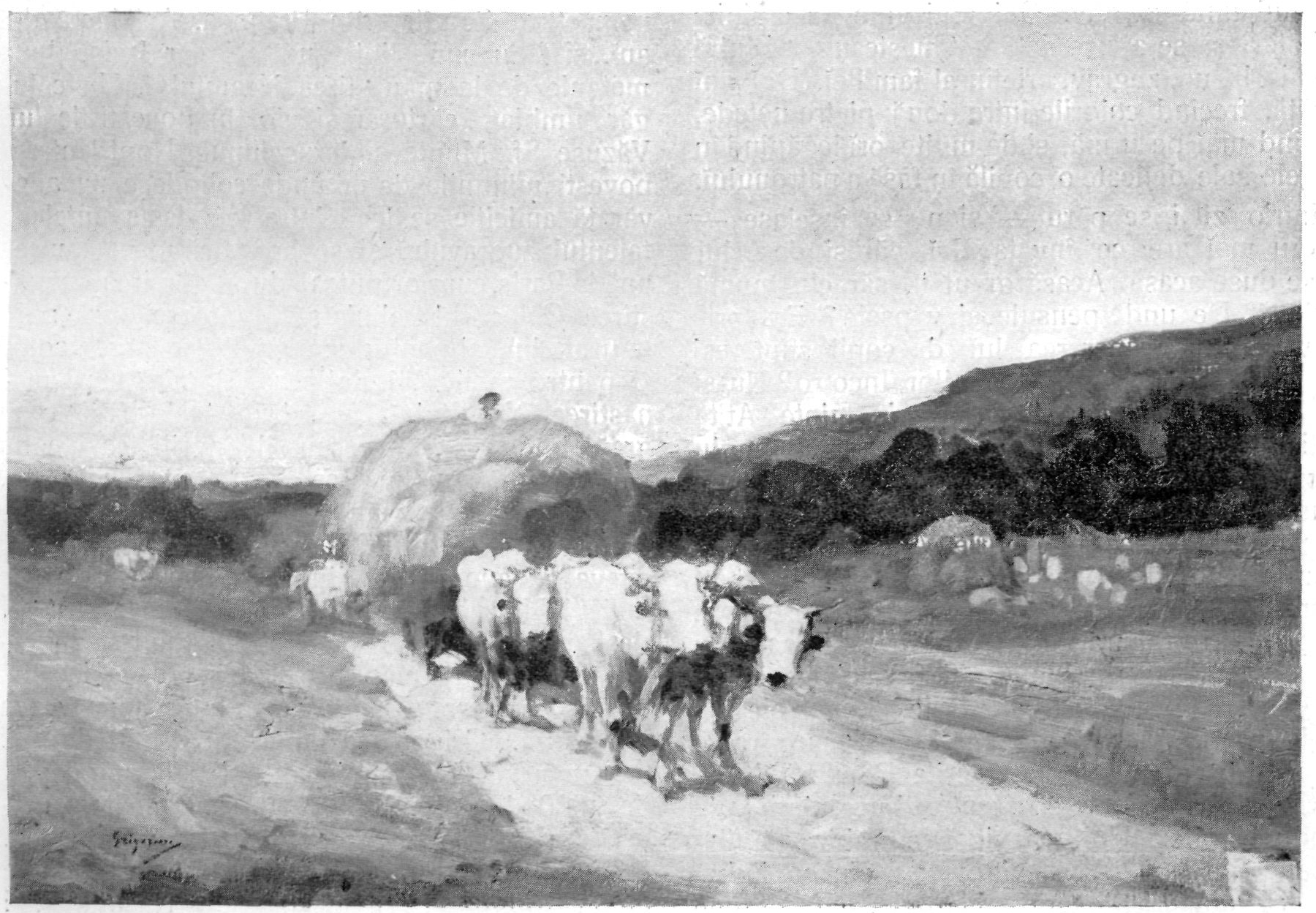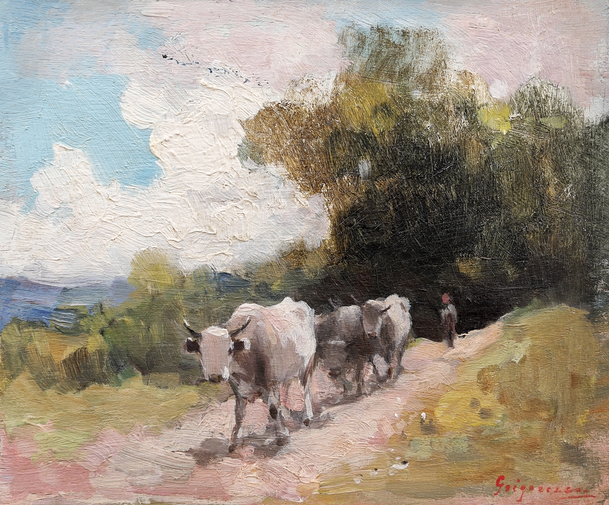 Numele lui Nicolae Grigorescu este strâns legat de extinderea picturii românești către modernitate. Artistul se prezintă în fața lumii drept un făuritor de partituri picturale pe care le dedică țării sale. Pledează pentru onestitatea sentimentului și militează pentru reprezentarea naturii plaiurilor natale într-o manieră profund purificată, picturală și sintetizată prin farmecul artei. Viața însăși va reprezenta punctul de pornire al operei sale, astfel, el va căuta stăruitor un limbaj pictural prin care să redea cât mai veridic frumusețea meleagurilor românești. În timpul șederii sale la Paris, află de la colegii de școală de existența grupului de artiști de la Barbizon. Se alătură mișcării în parcursul său spre o pictură mult mai realistă și lucrează alături de câțiva dintre fruntașii artei franceze: Rousseau, Courbet, Millet, Monet sau Renoir. La Barbizon se inspiră din viața țăranilor francezi și transpune pe pânză peisaje și figuri umane specifice spațiului geografic în care lucrează. Grigorescu dobândește aici mai cu seamă o atitudine asupra vieții și a rostului artei, lăsând maniera picturală să conveargă către un plan secund. În perioada studiilor din Franța, predilecția sa către peisaj este profund accentuată. Va căuta activ panorame și fresce captivante pe parcursul întregii sale cariere artistice și va imortaliza frumusețea plaiurilor natale cu o virtuozitate inegalabilă. Așa cum amintește Alexandru Vlahuță în volumul pe care i-l dedică pictorului, peisajul apare, în opera lui Grigorescu, drept ” o fereastră deschisă larg în lumina de afară”. Cu o reflexivitate ieșită din tipar, artistul nostru va medita asupra condiției omului de la sat și va realiza o veritabilă panoramă a spațiului rural românesc. Își alege natura ca model și dedică o amplă parte a creației sale carelor cu boi. Va săvârși, de-a lungul vieții, un studiu consecvent al reprezentantului din familia bovinelor și îl va include pe tovarășul de muncă și de suferință al omului de la sat în multe dintre lucrările sale. Cercetează boii cu o răbdare extraordinară și îi zugrăvește cu vădită simpatie în pânzele sale. Pictează șiruri pitorești nesfârșite, turme întoarse de la câmp, grupuri surprinse în timp ce se apropie sau în momentul îndepărtării lor din prim plan. Opera sa debordează de un calm molipsitor, uneori pare că nici măcar adierile de vânt nu sunt schițate în liniștea pânzelor sale. Îl preocupă, de asemenea, integrarea subtilă a omului și a animalului în natură. De la vitalitea din prim plan și până la planurile secunde care se estompează ușor, Grigorescu pictează săteanul modest și viața rurală lipsită de încifrări complexe. Reușește, ca nimeni altul, să creeze o concordanță aparte între păstorii turmelor și animalele reprezentate. Pictează cu o desăvârșită libertate siluetele de țărani surprinși în ipostazele vieții pastorale cotidiene. Le sugerează fizionomiile sumar, fie printr-o repartizare atentă a luminii, fie folosind accente puternice, fie bizuindu-se pe treceri fine în umbră. Răpus de pneumonie în anul 1907, va fi condus către locul odihnei sale veșnice exact așa cum a descris el obiceiul în picturile sale – într-un car cu boi.