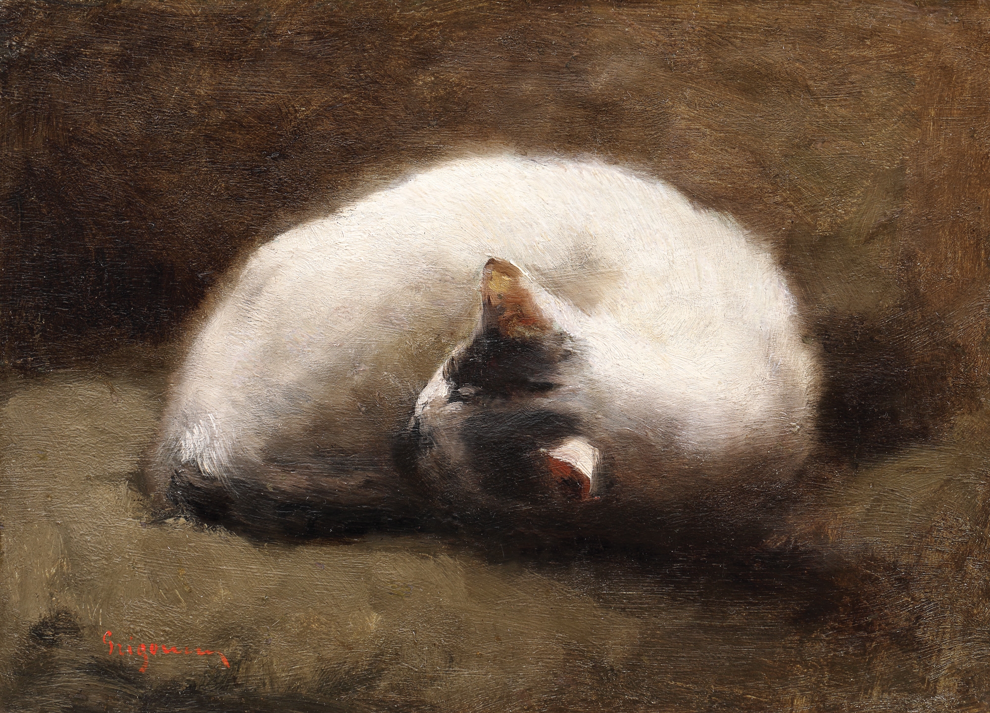 Deși se oprește prin mai multe ateliere și studiază inclusiv la Paris, Nicolae Grigorescu va fi un autodidact care va ști cum să potențeze de unul singur darurile naturale de care dispune. Perioada de studii în străinătate corespunde cu realizarea unor adevărate exerciții analitice în muzeele franceze. Își fructifică timpul liber și îl transcrie în sesiuni de reproduceri după lucrările marilor maeștri universali. Astfel, va reuși să înțeleagă mai bine viziunea și tehnica acestora. La finalul studiilor, Grigorescu dobândește o deplină maturitate estetică și o însemnată putere de expresie picturală. Parisul este locul în care artistul se formează intelectual și mai cu seamă uman. Valorifică timpul petrecut pe meleagurile franceze pentru a expune cât mai mult. În 1867, în timpul Expoziției Universale de la Paris, una dintre lucrările sale este achiziționată de însuși Napoleon al III-lea. Spre deosebire de naturaliștii care obișnuiau să se concentreze asupra detaliilor inexpresive, Grigorescu reușește să potențeze forța uluitoare a esențialului. De cele mai multe ori, în căutările sale artistice, pornește de la un motiv umil pe care îl ridică - cu ajutorul unui piedestal imaginar - la rang de artă. Nevoia sa arzătoare de a crea în permanență se transpune în desene schițate rapid după toate elementele care îi instigă imaginația. Creația sa abundă în reprezentări picturale ale unor ființe precum pisica, musca, boul sau șobolanul. Acestea întregesc opera de factură animalieră a artistului și reiterează continua sa preocupare de a reprezenta tot ceea ce îl înconjoară.”Lumea – el o vedea în tablouri. Picta cu ochii, cu gândul, când nu picta cu mâna.”, subliniază Alexandru Vlahuță în volumul pe care i-l dedică artistului. Începând cu picturile rupestre și până în zilele noastre, micile făpturi au servit, în creațiile multor maeștri, drept elemente încărcate de simboluri. Pisica apare, de obicei, ca o reflecție a senzualității și seducției, ca un vânător aflat într-o așteptare latentă a prăzii sau ca o zeitate ce trebuie să fie venerată. La Grigorescu, însă, conotațiile pe care le oferă ipostaza în care este surprinsă felina sunt cu totul altele. Artistul surprinde animăluțul ghemuit, aflat în căutarea confortului domestic. Modul în care artistul contorsionează trupul pisicii trădează, însă, euforia și securitatea de care are nevoie pentru a ațipi într-o asemenea conjunctură. De la DaVinci care afirma că ”până și cea mai mică felină este o operă de artă” și până la artistul român care a dedicat cel puțin trei lucrări în ulei protagonistelor în speță, lumea artei s-a arătat foarte primitoare față de universul pisicilor. Lucrarea de față intră în categoria puținelor configurări în ulei a unor ființe din afara familiei bovinelor din opera lui Grigorescu. Pensulația și jocul de lumini ni-l confirmă pe artist în postura iubitorului de natură, dornic să traducă în pânzele sale cât mai multe fragmente din cadrul fabulos care i-a dominat întreaga creație. Dacă în pictura universală micile făpturi apar adesea surprinse furișându-se în cadru, în opera lui Grigorescu viețuitoarele se bucură de lumina insolită a prim-planului. Protagonista lucrării de față toarce, lipsită de griji, sub pensula ocrotitoare a creatorului său. Depășește planul schiței și îl perturbă atât de mult pe stăpânul său încât ni se prezintă zugrăvită în ulei. Ne invită să o contemplăm medidativ și totodată se concentrează asupra propriei reverii, ignorându-ne în stilul său caracteristic de felină.