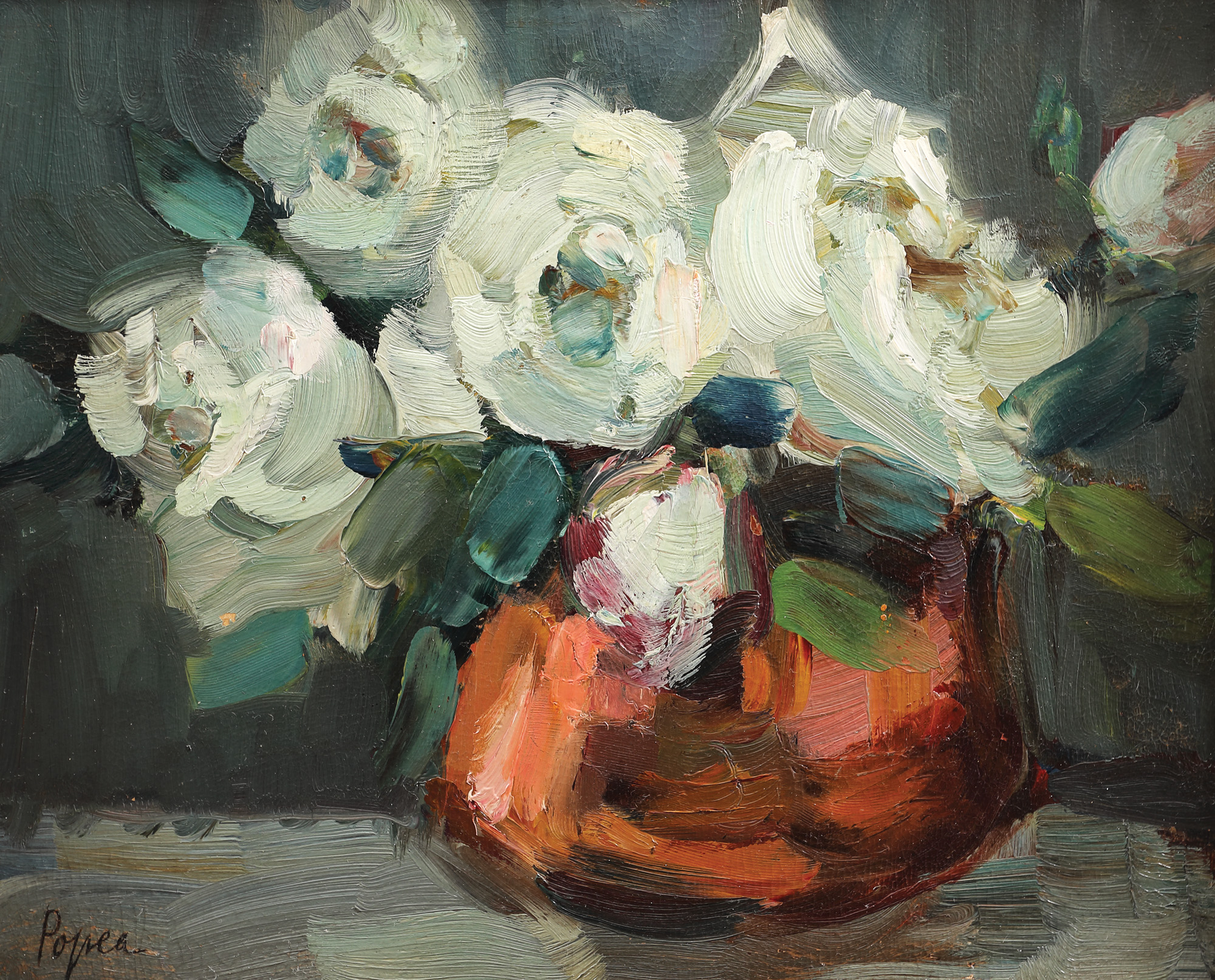 Creația sa pendulează între tradițiile autohtone și învățăturile cosmopolit-europene pe care le întreprinde atât la Paris, sub îndrumarea lui Lucien Simon și a lui André Lhote, cât și în Germania, unde se familiarizează cu stilul impresioniștilor și cu pictura în plein-air. Una dintre primele sale etapele de creație juxtapune impresionismul german și post-impresionismul francez. Artista va picta multe peisaje și naturi statice cu flori, reușind să redea cu îndemânare atât caracterul intim al interiorului, cât și dramatismul scenelor exterioare. Este o etapă profund subiectivă, în care artista își rezervă dreptul de a experimenta mult. În naturile statice ale Elenei Popea predomină îndeosebi elegiile florale. Folosește tușe cursive, dar energice, debordând de vitalitate. În opera de față, fundalul este modelat în nuanțe intense de gri, care contrastează puternic cu albul trandafirilor. Pasta susține anatomia plantei și converge mai departe de aceasta, acoperind canceul. Lucrează cu tonuri preponderent neutre, însă folosește câteva accente de brun-roșiatic în realizarea vasului care susține motivul vegetal.