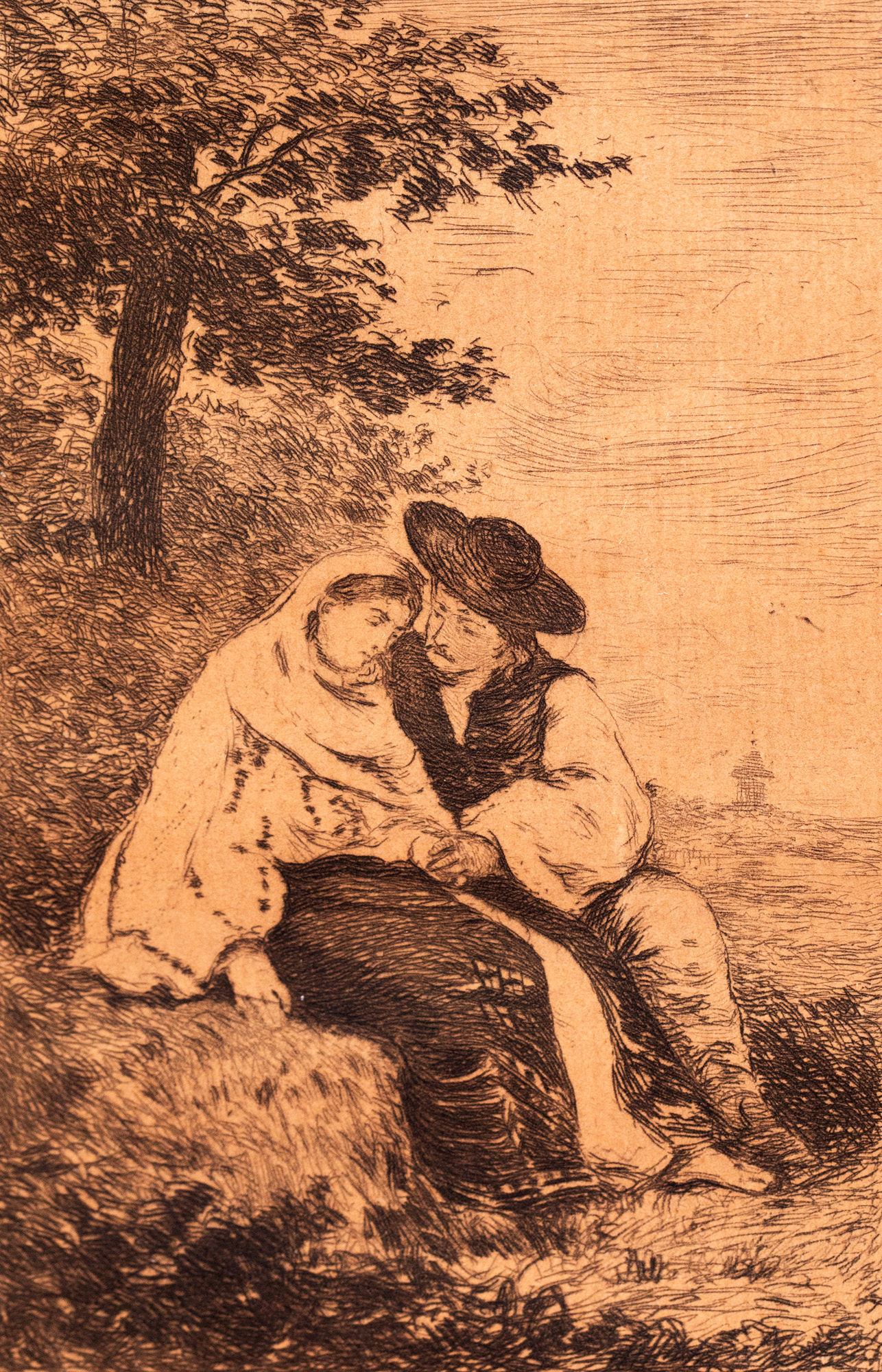 Opera este o interpretare după "Idilă rustică", operă conservată la Muzeul Judeţean Arad. O variantă a operei este reprodusă în volumul ”Centenar Theodor Aman”, Editura Venus, București, 1991, la cat. XXV. Opera este menționată în ”Theodor Aman gravor”, catalog de Mariana Vida, București, 1993, la pag. 90. O variantă a gravurii este reprodusă în "Repertoriul Graficii Românești din secolul al XIX-lea", vol. I, cat. 181. O variantă a operei este reprodusă în catalogul expoziției ”Theodor Aman, Primul artist român modern”, Art Safari, Editura MMB, București, 2023, la pag. 162. O variantă a operei se regăsește în colecția Muzeului Național Brukenthal, Sibiu.
