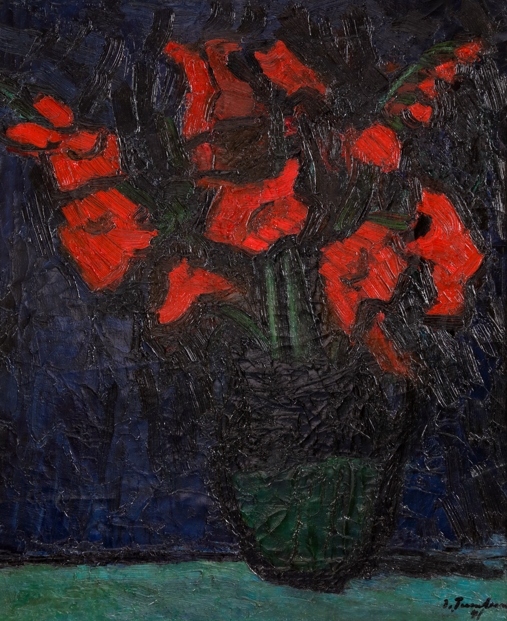 Titular al unei duble vocații, ce se întinde de la universul hipnotizant al artei și până la tărâmurile fascinante ale științelor naturii, Ion Țuculescu își va croi drumul printre notele distincte ale simbolismului, ale post-impresionismului ori ale expresionismului, și până la etapele folclorice ori totemice cărora și-a încredințat creația. Cercetarea și nevoia constantă de-a experimenta vor constitui cheia îmbinării tuturor îndeletnicirilor sale. Încă de la debutul său expozițional va fi întâmpinat călduros de unul dintre cei mai reprezentativi critici ai vremii, George Oprescu. Cu o pondere semnificativ redusă în economia creației sale, naturile statice reprezintă un prilej ideal pentru experimentul plastic. De la lucrările cu fructe și legume realizate în anii ’20 și până la fascinantele elegii florale realizate în jurul anilor ’40, în care tumultul interior iese la suprafață printr-un colorit specific, este remarcabilă evoluția tehnică și stilistică a artistului. Ion Țuculescu se va evidenția, așadar, în postura de interpret al naturii încă din perioada debutului. Acest fapt îi va permite familiarizarea cu bazele picturii și cu asimilarea și perfecționarea tehnicii. De la ”Florile de cais” ce datează din 1924, redate sub influență academist-impresionistă și până la exburenațele cromatice specifice anilor ’40, vom remarca specificitatea motivului central al lucrărilor ca fiind constituit din motive preponderent vegetale. Subiectul se va contopi acum cu fundalul și va contribui la potențarea reciprocă a forței creatoare. ”Înainte de a fi anumite flori trebuie să fie o pictură”, remarca artistul. Însă florile lui Țuculescu transpuse în ulei au fost precedate de o serie de lucrări realizate în guașă ori pastel pe hârtie. Dezvăluind atenția deosebită a savantului, artistul nu va mai fi preocupat de redarea fidelă a realității, ci va miza mai degrabă pe emoția imprimată subiectului. Regăsim în seria consacrată pastelurilor veritabile panoplii alcătuite din crizanteme, crini, trandafiri sau gura-leului. Dispuse pe suprafața mesei ori urcate pe piedestal, vasele albastre, brune ori violet ne destăinuie, triumfătoare, neîntinatul conținut. Anul 1938 coincide atât cu plecarea lui Țuculescu către îndeplinirea stagiului militar, cât și cu organizarea primei sale expoziții personale la Ateneul Român (susținătoare avidă și iubitoare, soția sa va fi cea care se va ocupa de închirierea sălii și alte detalii de ordin organizatoric). Odată cu izbucnirea războiului, paleta artistului va căpăta atribute mult mai întunecate și se va mula pe sensibilitatea pictorului concentrat ca medic militar. Permutările stilistice pot fi, așadar, corelate evenimentelor social-politice la care Țuculescu va fi nevoit să ia parte, iar perioada conflictului mondial se va transpune pictural în așa-zisa ”perioadă neagră”. Cromatica fovă va fi exemplificată îndeosebi după anul 1938, vădind infiltrările neobosite ale negrului pe toată suprafața pânzei. Opera de față ne destăinuite preferințele cromatice ale lui Țuculescu prin utilizarea roșului sangvin, a violetului ori a declinărilor de verde. Pasta groasă, dispusă energic, geometria și delimitarea concretă a planurilor dar și accentele puternice de roșu suprapuse peste fundalul întunecat ne invită să pătrundem în universul creator al artistului preocupat acum de materializarea formei în manieră proprie. Natura statică devine o stare sub pecetea căreia Ion Țuculescu își dezvăluie eul creator într-o coregrafie debordantă.