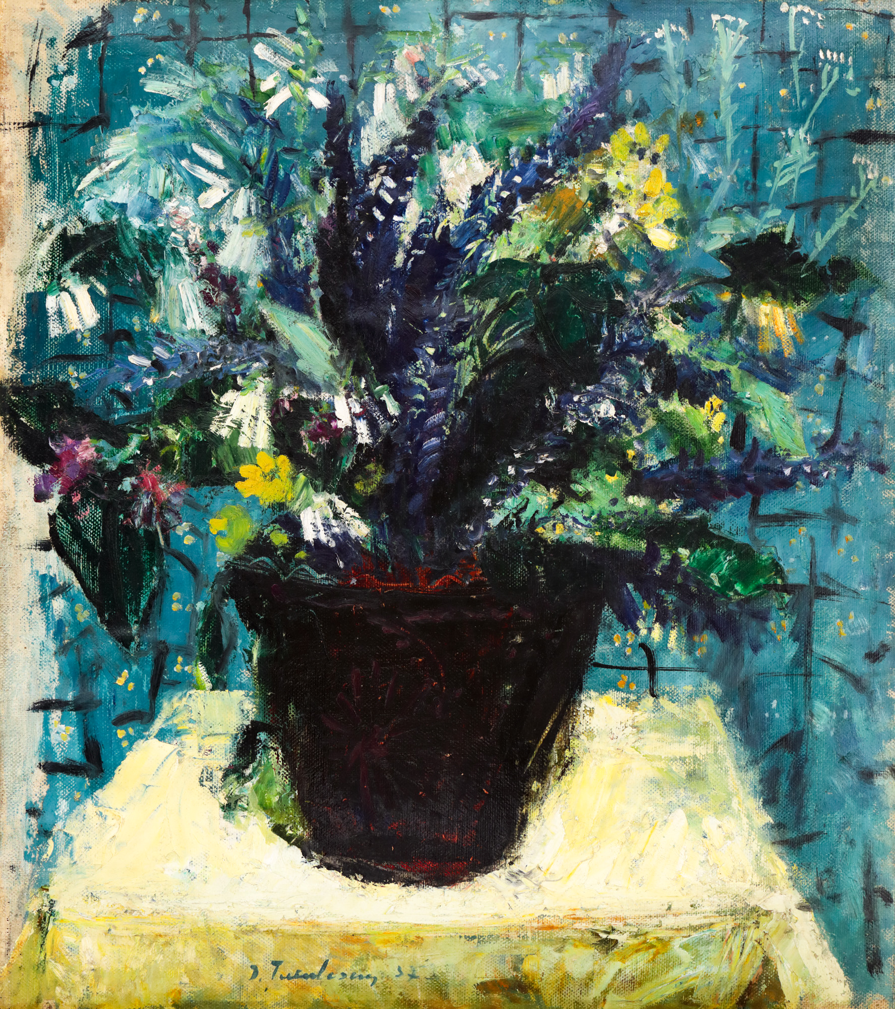 Deși deschide pentru prima dată o expoziție la Craiova la vârsta de doar 15 ani (o parte din lucrări vor fi achiziționate, iar cu banii strânși își va permite să parcurgă un periplu de studii în Italia), parcursul artistic al lui Ion Țuculescu va cunoaște o pauză îndelungată, până în jurul anului 1936, atunci când, încurajat de partenera sa de viață, va relua drumul picturii. Opera de față datează, așadar, din perioada de reîntâlnire a artistului cu pictura, perioadă profund marcată de intensitatea culorii. Țuculescu absolvă medicina ”magna cum laude” și debutează ca profesor de științe naturale. Drumul profesional ales îi va permite, totuși, să cocheteze în continuare cu pictura. Se înfățișează în postura de pictor în anul 1938, în cadrul unei expoziții personale organizate în clădirea Ateneului Român. Expoziția va stârni curiozitatea, interesul și admirația criticului George Oprescu, dar și aprecierile lui Gheorghe Petrașcu. Înzestrat cu veleitățile autodidactului efectuează studii libere, ”după natură și după maeștri”, așa cum el însuși afirmă. Își va utiliza dubla vocație, de biolog și creator, pentru a transcrie pe pânză veritabile pagini de natură cu ingeniozitatea savantului. Reface călătoriile predecesorilor săi în orientul mediteranean și în importantele capitale occidentale și recuperează, astfel, materialul vizual necesar experimentelor plastice viitoare. Se inspiră de la Petrașcu, Andreescu sau Luchian, dar se oprește și asupra unui Van Gogh sau a unui Gauguin. Spațiul său plastic, infinit și cu materializări neobișnuite, este brăzdat de o luminozitate artificială și de o cromatică brutală devenită laitmotiv. Acordurile sale ornamentale sunt încastrate în accente de negru, nuanță pe care o asimilează din lucrările lui Petrașcu. Păstrează frânturi recognoscibile ale spațiului real din care se inspiră, însă le modifică în conformitate cu stimulii proprii. De la câmpurile de rapiță ori panoramările satelor românești și până la canalele venețiene, podurile din piatră și clădirile colorate ale Italiei, Ion Țuculescu ne poartă, cu ajutorul operelor sale, printr-o binevenită călătorie în jurul lumii. Fie că lucrează în ulei, sau fie că transpune peisajul citadin în acuarelă, artistul are în vedere transformarea planșei într-un jurnal vizual al propriei sale vieți. Vasul cu flori de câmp, înfățișat în nuanțe închise, în care predominant e negrul, contrastează puternic cu fața de masă albă, dar și cu peretele în tonuri de albastru. Prezentă pe simezele mai multor expoziții, începând cu cea dintâi personală de la Ateneu și până la expoziția din 1965 de la Muzeul de Artă din Constanța ori retrospectiva organizată la Muzeul Național de Artă în 1999, opera de față a fost constant readusă în atenția publicului, rămânând o piatră de hotar pentru debutul artistic al autorului său. Ion Țuculescu rămâne în istoria artei românești drept amatorul devenit profesionist, cu o incomensurabilă putere de revitalizare a stilisticii desuete a artei populare.