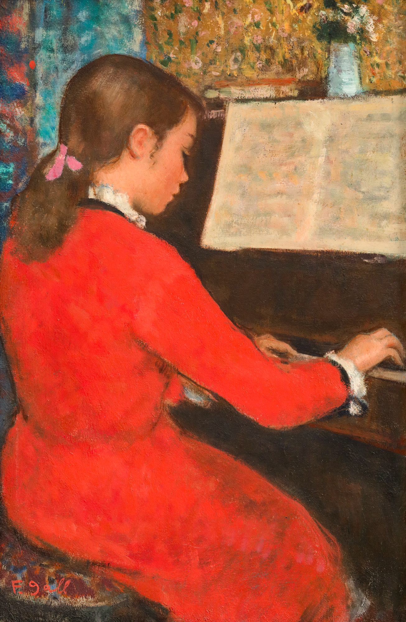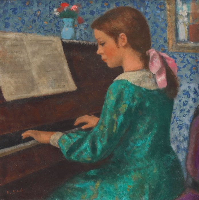 Pornind de la impresionism și ajungând până la școala modernă a Parisului, Francisc Gall studiază îndelung principiile compoziționale ale desenului și excelează în aplicarea acestora în lucrările sale. Atmosfera lirică a tablourilor sale va fi evidentă atât în lucrările în care îi servesc drept modele propriii copii sau soția sa, cât și în cele în care descoperim, uneori, și alte personaje. Francisc Gall va fi un fin observator al modei vremii și va transcrie cu un devotat talent detaliile ținutelor personajelor sale. Își surprinde protagoniștii la cafenea, la picnic, cântând la pian, dansând sau aflându-se pe stradă ori la plajă. Își găsește inspirația în lucruri simple, preluate din cotidian și realitatea imediată – o masă, un scaun, un vas cu flori ori un pian vor deveni subiectele principale ale operei sale. După studiile efectuate la Roma și Paris, artistul se va stabili definitiv în Franța, iar opera sa va începe să fie apreciată pe meleagurile străine și va primi recunoștința gazdelor sale sub forma a diferite distincții. Paleta sa începe să se deschidă și să preia din luminozitatea impresioniștilor. Lucrările sale devin indubitabile trimiteri la ”jeunes filles en fleurs” ale lui Marcel Proust. Veșmintele și coafurile corespunzătoare unei epoci trecute, sau accesoriile precum umbrelele sau capele vor capta frumusețea umană în eternitatea pânzei. În opera de față artistul reia unul dintre subiectele dragi lui: muzica, și mai cu seamă pianul, care alături de lucrările dedicate dansului îl apropie pe pictorul român de opera artistului francez Edgar Degas. Observăm preferința pentru cromatica vie, care se compune din nuanțe de roz, bleu, sau galben, dar și predispoziția pentru tușele scurte, juxtapuse, care contribuie la crearea atmosferei dorite de artist. Muza lui Francisc Gall debordează de vitalitate și exuberanță jovială, iar alegerea vestimentară, părul prin sus, legat cu o fundă, trădează vârsta tânără a fetei. Cu ochii îndreptați către partitură și mâinile așezate deasupra clapelor pianului, protagonista se află într-o imperturbabilă stare de concentrare, în care pare că niciun eveniment exterior nu i-ar putea deranja actul artistic. Fundalul nu ne oferă prea multe indicii cu privire la tipologia actului performativ în sine, astfel că nu putem ști dacă tânăra muză își exersează și perfecționează talentul sau dacă își demonstrează veleitățile muzicale în cadrul unui recital. Însă mimica feței și gestica trupului trădează maxima sa putere de concentrare, asemenea unei transe. Reprezentativă pentru întreaga sa operă, creația de față ne oferă suficiente date cu privire la calitățile de colorist și tehnica desăvârșită pe care le posedă Francisc Gall.