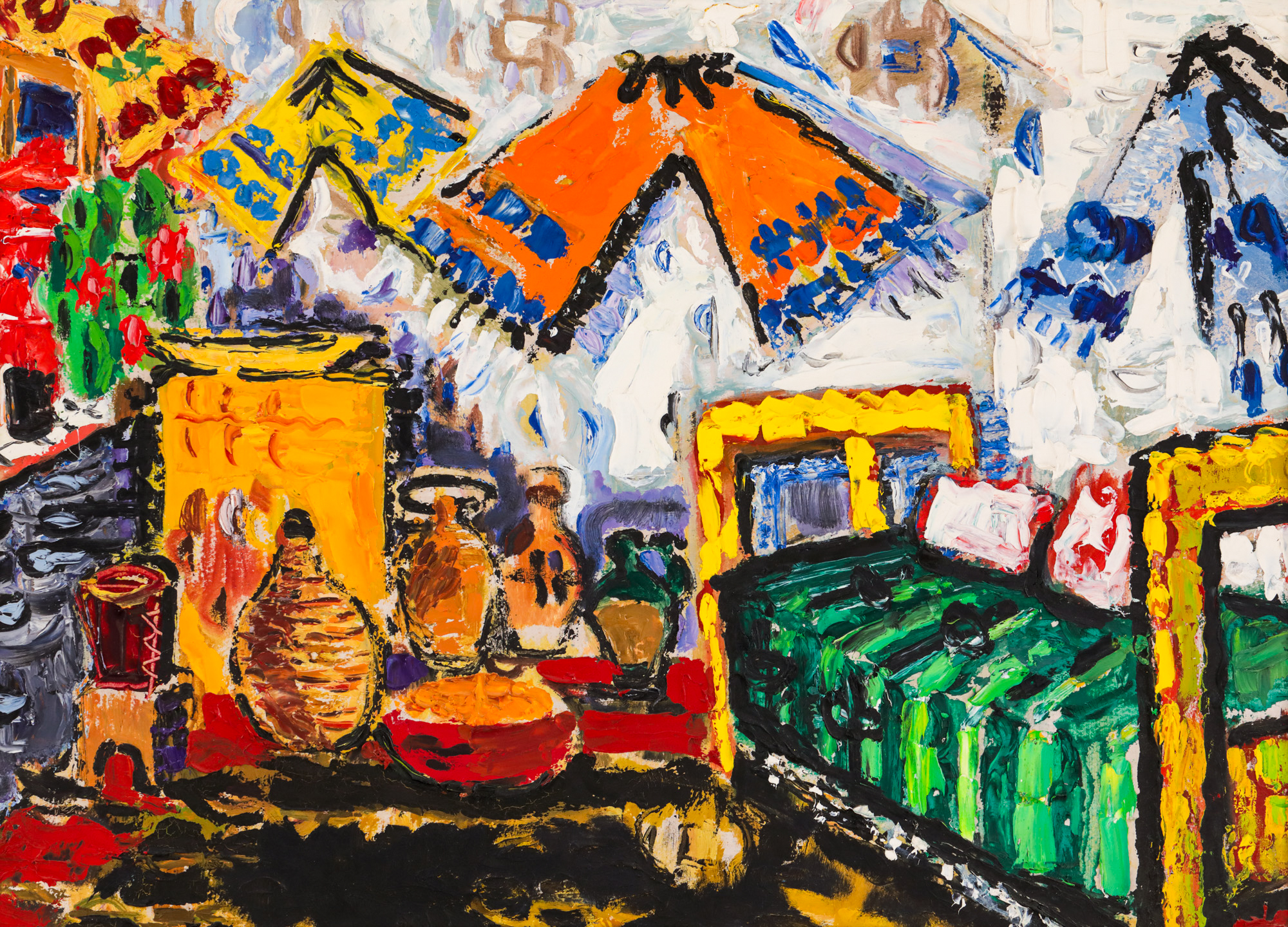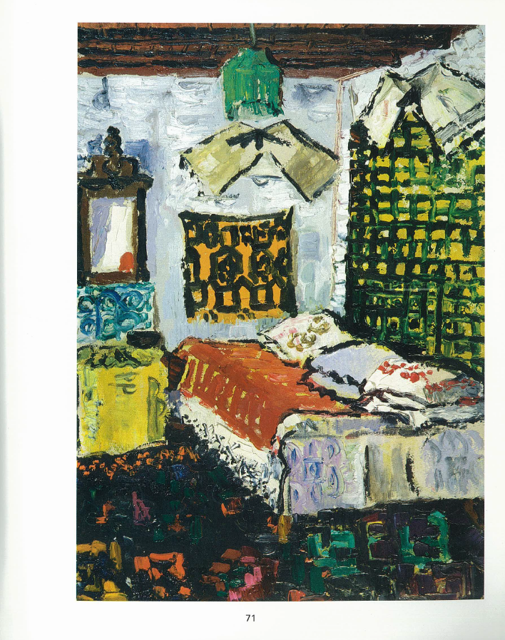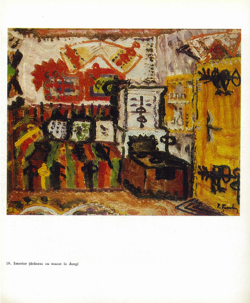 Primele interioare realizate de Ion Țuculescu apar în jurul anului 1942, aproximativ în aceeași perioadă în care încep să fie cunoscute tot mai puține naturi statice în creația sa. Ar părea, așadar, că artistul lucrează în cicluri interconectate și totodată bine delimitate, optând pentru transferarea căutărilor sale creative dintr-o tematică în alta. Parcurgerea muzeelor europene la finele anilor ’30 îl va aduce pe Țuculescu față în față cu celebra ”Camera din Arles” pictată de Vincent Van Gogh. Pornind de la aceste considerente, am putea desluși, în opera ”Atelierul pictorului” realizată în anul 1942, izvorul creației care a stat la baza conturării întregului ciclu dedicat interioarelor. Însă seva creatoare a lui Țuculescu va fi extrasă și din motive autohtone, prin apropierea de folclor. Seria interioarelor țărănești anticipează perioada profund folclorică din opera artistului, renumitele câmpuri de rapiță și perioada totemică. În opera de față, delimitându-se vădit de restul compoziției prin cromatica unică, macatul verde devine tema centrală a lucrării. Țuculescu realizează aici un exercițiu complex din care răzbate un exces voit de exuberanță cromatică. Optează pentru nuanțe intense și contraste puternice, utilizând preponderent nuanțe de albastru și galben. Perspectiva pe care o descompune artistul în motive plastice cuprinde cei trei pereți ai încăperii încărcați cu detalii stilistice exuberante. În partea dreaptă a compoziției regăsim patul, redat în nuanțe stridente de galben, cărora Țuculescu le-a inserat câteva unduiri roșiatice. Aceleași unduiri se vor prelinge către pernele așezate pe pat, deasupra elementului central al operei: macatul. Și în ilustrarea acestuia artistul se oprește asupra tonalităților cromatice care îl suscită vizual. De la verdele crud, așezat direct pe carton și până la adăugirile de negru sau alb, pictorul își desăvârșește paleta cromatică în raport cu restul elementelor. În planul din stânga, regăsim fereastra încununată de prezența florilor. Albastrul nocturn care rezidă în geam, roșul și nuanțele de roz care se ivesc din mijlocul frunzelor verzi ale plantelor, ori ștergarul galben împodobit cu flori vișinii ne introduc ușor în atmosfera lirică a creației. Central, peretele din spate e decorat cu podoabe tradiționale specifice zonei din care își desfășoară activitatea pictorul. Multiplicarea și diversificarea ștergarului invocă o lume arhaică și devine totodată un arhetip sacru al satului ancestral. Acestea vor fi ilustrate preponderent în tonuri calde, de ocru și oranj. Nelipsite sunt și vasele oltenești, restrânse în același plan, direct pe podea. Artistul optează pentru tonurile pământii și implicit pentru apropierea de tradiții. Dacă în planul superior predomină nuanțele alb-albăstrui în redarea fundalului, planul inferior e brăzdat mai degrabă de tonuri închise, de brun și roșu. Forța lirică va lua forma unor descărcări cromatice contrastante și decorative, transpuse drept semne tradiționale care contribuie la crearea atmosferei. Bogat ornamentată, camera artistului ne invită să pătrundem mai adânc în intimitatea sa și ne deschide calea către descifrarea tumultului său interior. Țuculescu va prelua, în opera sa, elemente decorative de inspirație populară ce prezintă un caracter adiacent, fiind necesare omogenizării compoziționale. Semnificațiile scoarțelor oltenești rezidă acum în formule magice, îndelung prefigurate de artistul-ascet al imaginii.