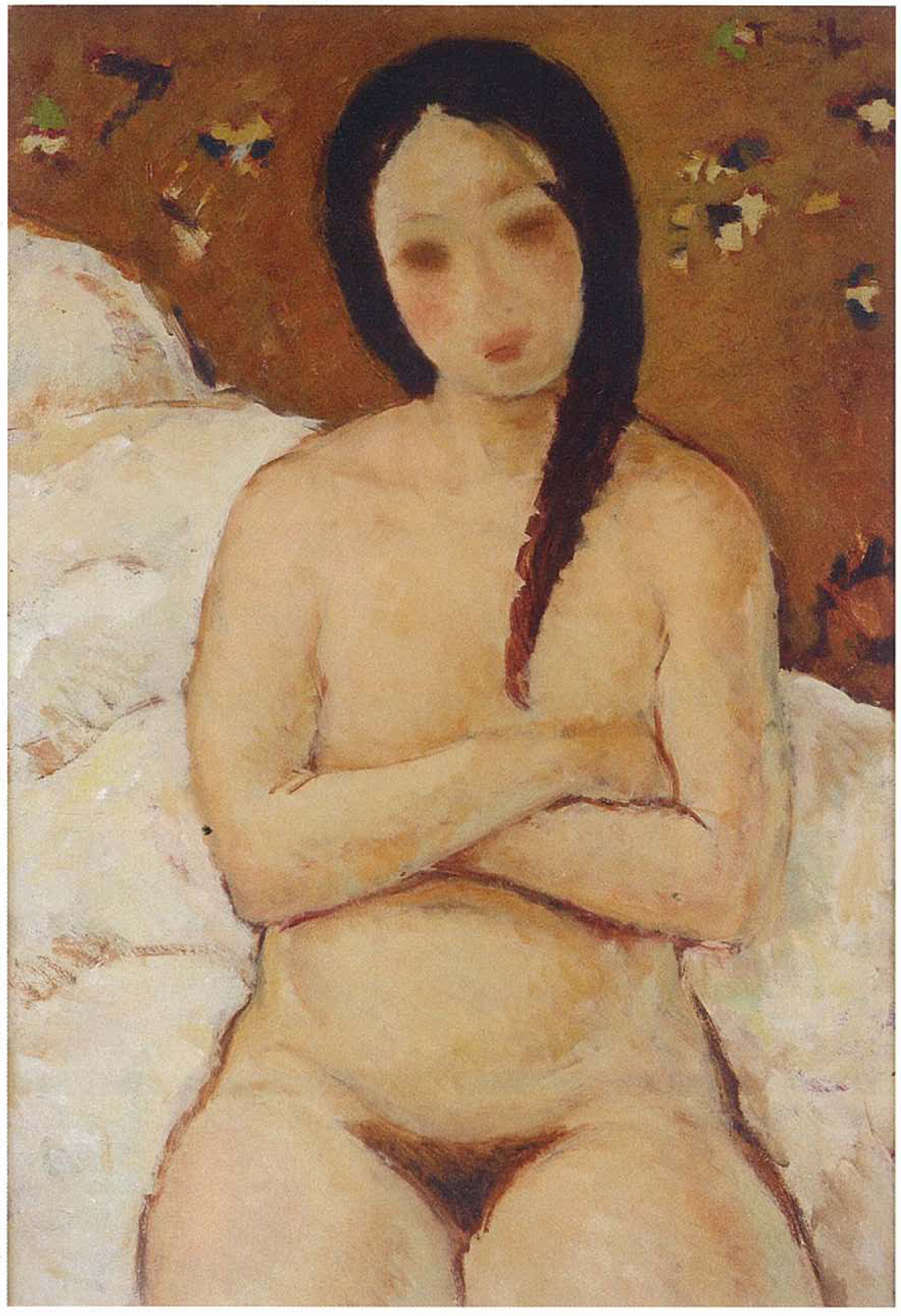 Lirismul creației lui Nicolae Tonitza se va răsfrânge și asupra subiectelor pentru care optează adesea: femeia, copiii, florile sau peisajul. Tonitza va fi asemănat, prin natura operei sale, cu Daumier, Manet sau Toulouse-Lautrec. Voluptatea formelor și grația trupurilor sculptate pe pânză amintesc de personajele pictate de Gauguin în Tahiti, în timp ce chipurile prelungi și ochii migdalați fac trimitere la protagoniștii imaginați de Modigliani. Nudul va deveni o temă predilectă în creația sa în jurul anului 1926. Nudul capătă, totodată, statutul de pretext pentru studiu și statutul de laitmotiv al operei sale. În textele sale teoretice, Tonitza recunoaște și dezbate polemica apărută în epocă în jurul reprezentării nudului în artă. De la nudul ilustrat în pictura cu un vădit caracter religios, la cercetările aproape paroxistice ale renascentiștilor, la corpul libertin înfățișat în manierism sau rococo și până la dramatizarea excesivă a trupurilor de către romantici și realiști, reprezentarea corpului feminin a luat adesea forma unor zeități, nimfe sau personaje mitologice. Odată cu impresionismul, însă, fizionomiile feminine dezgolite vor începe să contureze profilurile unor personaje obișnuite, inspirate din cotidian. Tonitza înțelege și preia în opera sa sensul transcedental al subiectului și descrie nudul drept un microcosmos înăuntrul căruia artistul își poate depozita întreaga materie picturală, întreaga bogăție a nuanțelor și desăvârșita incandescență a luminii. Veleitățile desenatorului, pe care le va dobândi mai cu seamă pe băncile școlii müncheneze, se vor dovedi a fi prolifice și în pictură. Preferă să lucreze din amintire, după ce realizează un studiu în prealabil după model și își raportează întotdeauna formele plastice la adevărul vieții. Vocația sa pentru culoare e împrumutată grației și tonalităților distincte ale nudului feminin. Propune ritmuri liniare melodioase și le învăluie cromatic în aceeași manieră. Integrează condeiul desenatorului și în pictură și acordă o expresivitate deosebită tonurilor și nuanțelor. Tonitza efectuează studii consecvente și îndelungate, își transcrie cercetările în creion și abia apoi le adaugă culoarea, dezvăluind, astfel, impresionanta sa capacitate analitică. Deprinde redarea proporțiilor corpului uman prin exerciții recurente și recompune formele conform propriei sale viziuni. Folosește tușe largi, expresive și acordă un rol constructiv liniei, formei și culorii. Își demonstrează preferința pentru planurile cât mai largi și jocurile subtile de lumini. Tonitza își surprinde personajele în intimitatea căminului, în iatac, la Mangalia sau la Balcic. Pe lângă muzele feminine din familia sa, vor apărea și alte modele în lucrările sale. Va picta, asemenea multor alți artiști, la Balcic sau în Dobrogea. Dezvăluie pitorescul locurilor și cursul existenței turcilor de la Marea Neagră, dar în peregrinările sale va lua cunoștință și de frumusețea și exotismul tătăroaicelor, pe care le va plasa de cele mai multe ori în luxuriantele fresce dobrogene. Uneori își individualizează modelele, notând numele acestora pe spatele lucrării. De cele mai multe ori, însă, redă atmosfera intimă și căldura interioarelor. Devine un observator atent, care sintetizează fidel trăsăturile muzelor sale, reinterpretându-le prin linii elegante. Surprinde atitudini distincte și conferă trupului o construcție simbolică. Personajele sale sunt prezentate adesea într-un contrast evident cu fundalul. Deși optează de cele mai multe ori pentru o cromatică neutră, folosește tonuri puternice și contururi în nuanțe închise. Interesul pentru natură și auspiciile traiului cotidian sunt transpuse în liniștea intimă care curpinde arabescurile decorative ale liniei. Distingem, și în opera de față, această predilecție pentru fundaluri în nuanțe închise, în care surprindem atmosfera rece și duritatea peretelui din planul din spate. În partea inferioară, deslușim cearceaful alb, pe care tânăra protagonistă își așează trupul dezgolit. Cu părul negru tuns scurt și privirea ațintită către un punct focal exterior, mâna sprijinită pe divan și spatele ușor aplecat, protagonista lui Tonitza adoptă o poziție ce sugerează fie proaspăta ședere pe divan, fie intenția tinerei de a se ridica și părăsi încăperea. Opera a figurat în reputata colecție a doctorului Iosif Dona și a fost inclusă, de asemenea, în monografia pe care Ionel Jianu i-a dedicat-o artistului în anul 1945. Aplicând preceptele propriului său crez: ”Cine se lasă cucerit în fața unui nud de voluptatea cărnii și nu de voluptatea de a picta – ratează”, Tonitza se înscrie în lungul șir de artiști care au căutat cu aviditate să redea pe pânză rezultatele unor cercetări îndelungate asupra corpului uman, ci nu doar să transcrie, imitativ, formele și voluptatea modelului.