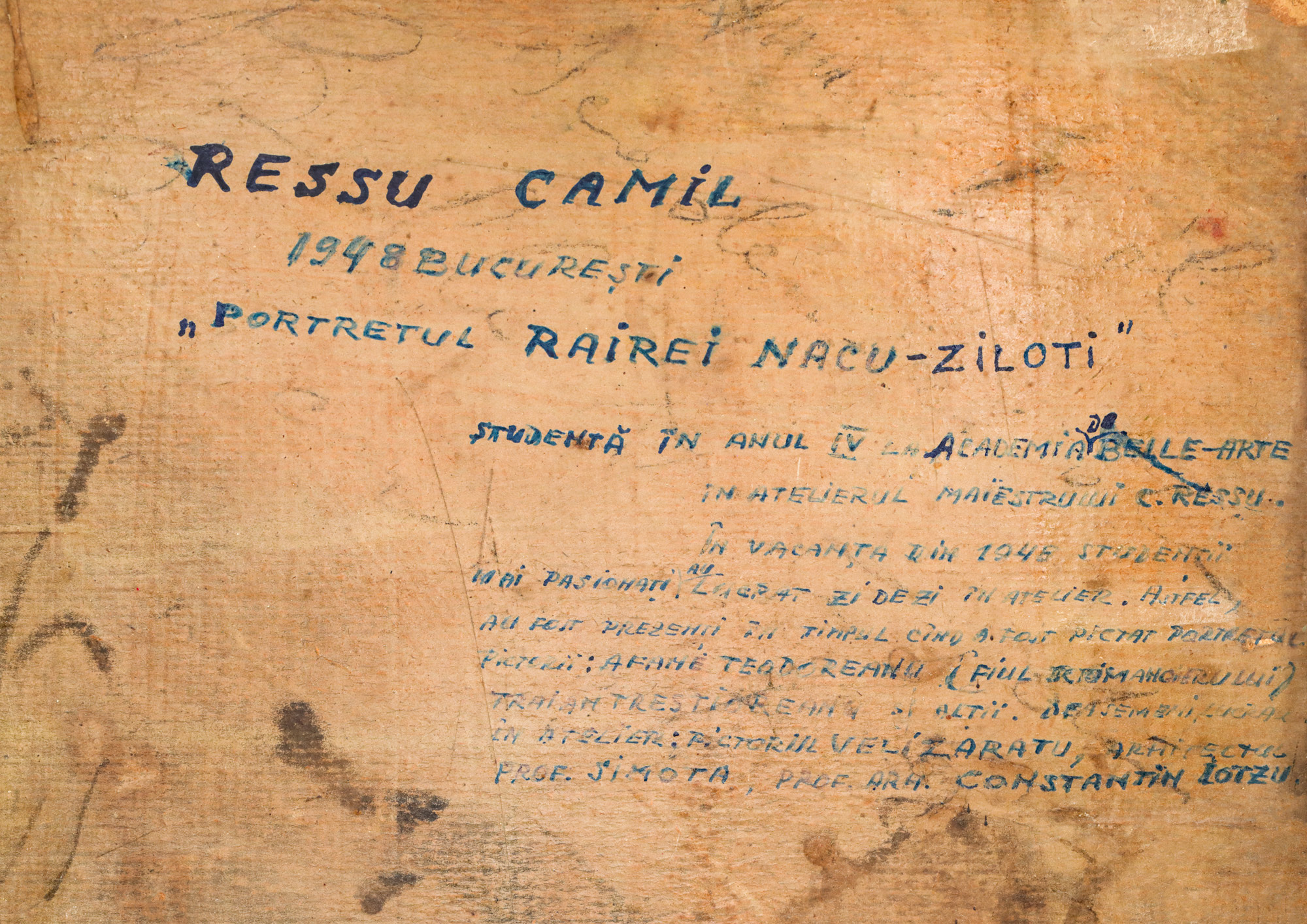 Pe verso, notat: ”Studentă în anul IV la Academia de Belle-Arte în atelierul maestrului C. Ressu. În vacanța din 1948 studenții mai pasionați au lucrat zi de zi în atelier. Astfel, au fost prezenți în timpul când a fost pictat portretul pictorii: Afane Teodoreanu (fiul romancierului [Ionel Teodoreanu]), Traian Trestioreanu și alții. Deasemeni, lucrau în atelier: Pictorul Velisaratu, Arhitectul Prof. Simota, Prof. Arh. Constantin Iotzu.”