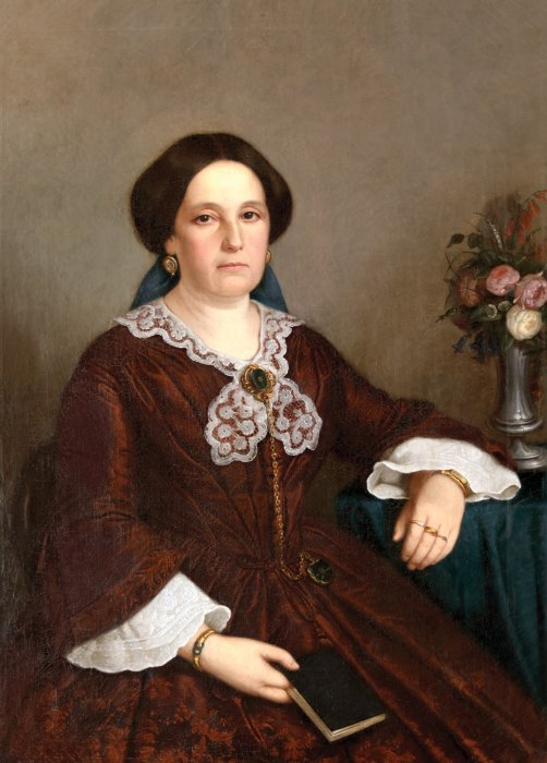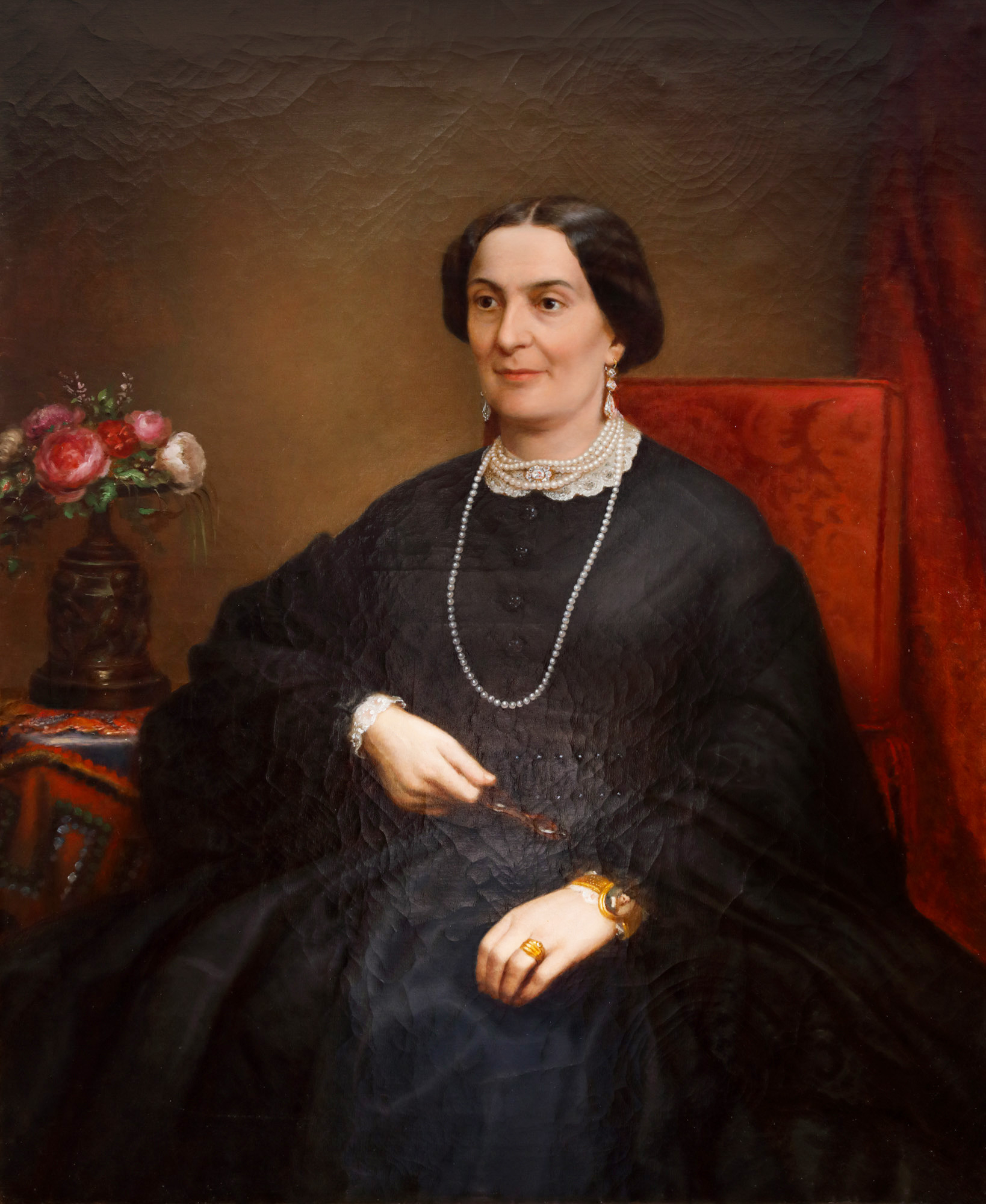 Deși în epocă era practicat un stil pictural a cărui esență era eminamente religioasă, cu rol decorativ în lăcașurile de cult sau în căminele boierești, acest tip de artă bizantină a fost abordat mult mai frugal de către tânărul artist școlit în străinătate. Constantin Lecca se va orienta asupra portretisticii, demonstrând în mod clar influențele școlii vieneze. Își desăvârșește formarea artistică la Buda, Viena, Roma și Berlin, urmând ca la Roma să deprindă meșteșugul copiștilor prin reproducerea unor tablouri celebre. Acestea stau mărturie studiilor realizate în străinătate, iar Constantin Lecca se va număra printre primii artiști români care practică astfel de îndeletniciri. Întors în țară, își deschide propria tipografie la Craiova, în jurul școlii centrale (având încheiată o înțelegere în privința finanțării cu unitatea de învățământ). Vor fi tipărite aici reviste (”Mozaicul” rămâne printre cele mai cunoscute), diverse publicații creștine sau de uz moral, piese de teatru sau dicționare. Va ocupa apoi catedra de desen și caligrafie a școlii de la Craiova și va fi, de asemenea, primul profesor de desen al lui Theodor Aman și Petre Alexandrescu. Cronicile vremii îl descriu drept un pictor influent, care a realizat pânze monumentale dedicate domnitorilor Mihai Viteazul, Radu Negru-Basarab, Dragoș Vodă, Dimitrie Cantemir, sau Ștefan cel Mare expuse ulterior în Școlile din București, spre a servi drept izvor istoric și prilej de admirație elevilor acestor școli. Va aborda cu aceeași iscusință și subiecte istorice ca încheierea păcii, desfășurarea bătăliilor sau a descălecatelor; dar va rămâne, în esență, un pictor romantic. Va întemeia un așa-zis ”triumvirat” în epocă, alături de pictorii Mișu Popp și Barbu Stăncescu. Împreună vor prelua diverse comenzi, de la pictarea stemei țării pe drapelele oștirii și până la zugrăvirea de biserici. Constantin Lecca manifestă însă o predilecție deosebită pentru revelarea caracterelor umane în portrete. Surprinde chipuri de nobili înstăriți, medici sau preoți; dar își pictează și soția, copiii, verii sau alți membri ai familiei. Aceste portrete sunt veritabile documente de epocă, datorită migalei de miniaturist pe care o atestă artistul în redarea vestimentației, a coafurilor, a dantelelor și a podoabelor. Realizează, practic, o întreagă galerie de portrete dedicată boierimii românești, însă se va orienta adesea și către propria-i persoană. Creează ciclul tematic al autoportretelor: aflat încă sub influența romantimsului vienez, dar în Italia, schițează un prim autoportret de tinerețe, păstrat astăzi de Academia Română. Realizată cel mai probabil la mijlocul secolului al XIX-lea, opera de față ne oferă, prin vestimentația și coafura specifice, vestigii ale unei întregi epoci. Rochia sobră, dar elegantă; părul prins după moda vremii; bijuteriile din aur, perlele și pietrele prețioase dezvăluie indicii importante cu privire la statutul social și rangul nobiliar al protagonistei. Cu o valoare remarcabilă, însă nu atât de ușor de procurat, perla apare drept un simbol pe ale cărui valențe le putem desluși în celebra expresie latină ”vanitas vanitatum”. Existența fatidică e încununată așadar de călătoria spirituală către atingerea perfecțiunii, iar perla devine un simbol al luminii și al feminității. Perla reprezenta de asemenea puterea și statutul, însă se putea traduce și prin trimiteri la divinitate. Cu valențe emblematice, dispuse mai ales în colecțiile regilor și ale nobilimii, perlele își vor face apariția în operele unor artiști precum Boticelli, Tiziano sau Vermeer. Cu priceperea miniaturistului, Constantin Lecca se va opri asupra unor detalii de ordin vestimentar precum dantela diafană cu irizații transparente, ce lasă să se întrevadă coloritul epidermei ce rezidă dedesubtul ei. Remarcăm de asemenea migala sub pecetea căreia a fost modelat șiragul de perle, atenția deosebită pe care o acordă artistul cutelor formate de închiderea nasturilor, bijuteriile aurite care împodobesc degetul inelar, dar și brățara în care distingem, lucrat cu aceeași deosebită atenție la detalii, portretul unui nobil. În jurul claviculei se evidențiază un seducător joc al eleganței, consemnat atât prin întrebuințarea materiilor prețioase, cât și prin intermediul celor diafane. Chipul respectă proporțiile fizionomice și păstrează mai degrabă o expresie neutră care tinde către schițarea unui zâmbet nedeslușit. În ceea ce privește coafura, remarcăm, în părul strâns atent, un tipar utilizat și de alți pictori ai vremii (J.H. Neuman în portretul ”Johanna Maria Constantia Vreede”, Émile Auguste Hublin în ”Portretul unei femei” sau Francesco Hayez în ”Ritratto di Giuseppina Negroni Prati Morosini”). Postura se înscrie, de asemenea, printre ipostazele preferate de nobilimea vremii. A sta la ”pozat” căpăta valențe unui veritabil ritual cu rădăcini încastrate de-a lungul mai multor secole. Putem menționa, așadar, postura demnă, cu spatele drept și capul ridicat, și cu bărbia situată într-o ușoară ascensiune. Privirea e ațintită către un punct focal extern; protagonista își concetrează aici atenția undeva în partea exterioară stângă a lucrării. Poziția mâinilor pare să fie îndelung studiată, acestea fiind așezate cu grijă deasupra trupului. În mâna dreaptă deslușim detaliile unui eventai, susținut între degete mijlocii, în pumnul strâns cu delicatețe în jurul obiectului. Mâna stângă e mult mai puțin contractată, degetele sunt apropiate, ușor îndoite, lăsând să se întrevadă bijuteriile purtate de protagonistă. Dacă brațul stâng alunecă ușor pe lângă corp, brațul drept pare a fi proptit pe masa situată lână personaj. S